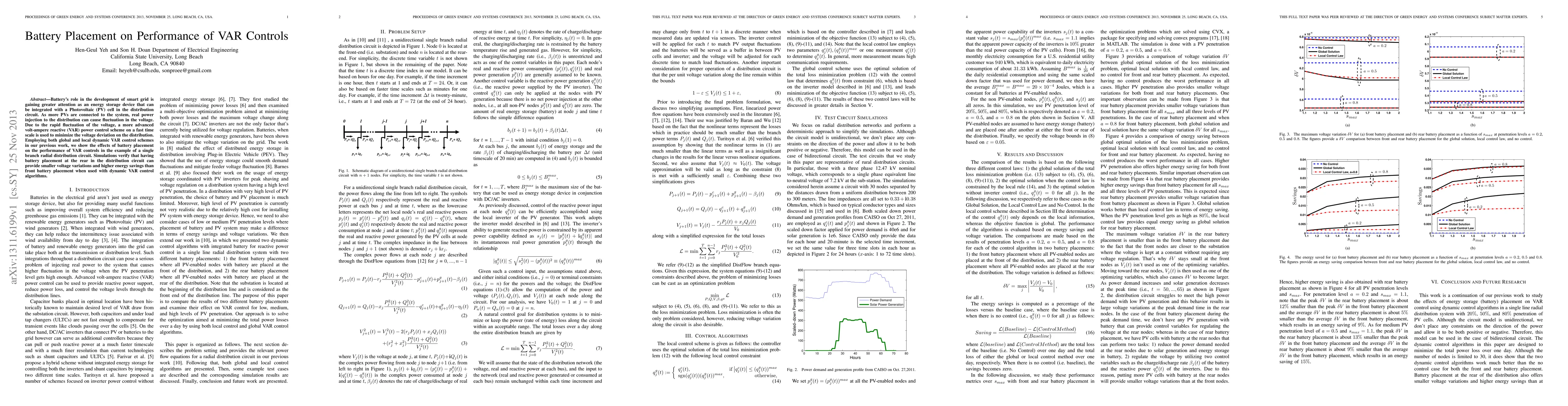 Battery's role in the development of smart grid is gaining greater attention as an energy storage device that can be integrated with a Photovoltaic (PV) cell in the distribution circuit. As more PVs are connected to the system, real power injection to the distribution can cause fluctuation in the voltage. Due to the rapid fluctuation of the voltage, a more advanced volt-ampere reactive (VAR) power control scheme on a fast time scale is used to minimize the voltage deviation on the distribution. Employing both global and local dynamic VAR control schemes in our previous work, we show the effects of battery placement on the performance of VAR controls in the example of a single branch radial distribution circuit. Simulations verify that having battery placement at the rear in the distribution circuit can provide smaller voltage variations and higher energy savings than front battery placement when used with dynamic VAR control algorithms.