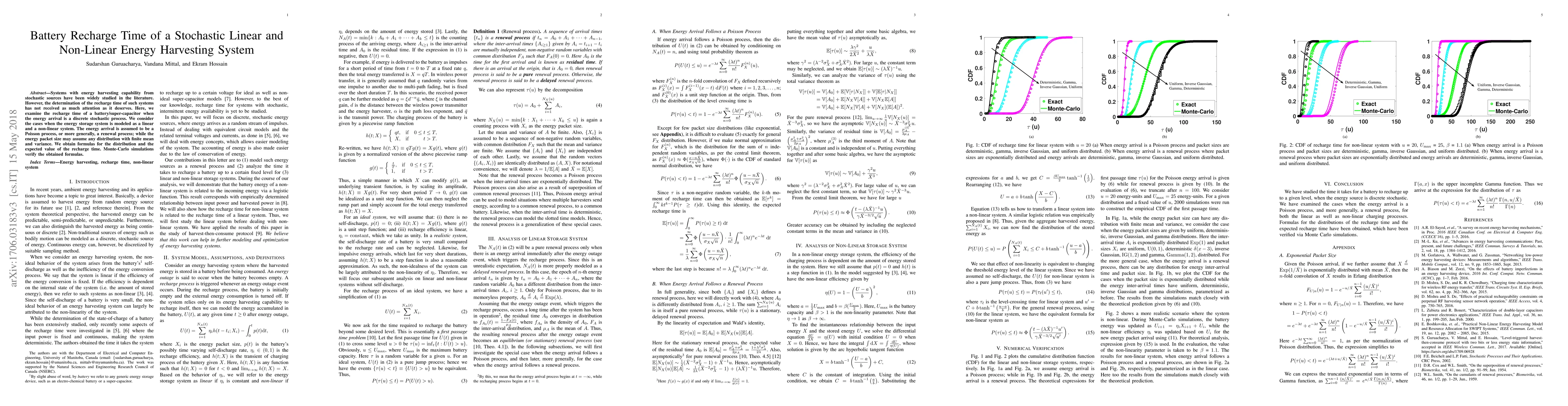 Systems harvesting energy from a stochastic source have been widely studied in the literature. However, we are not aware of any work that deals with the time it takes for a battery to recharge up to a given level, when the energy source is discrete stochastic. This letter aims to examine the recharge time of a perfect battery. We examine the cases when the energy arrival is a Poisson process, and more generally, a renewal process. We obtain formulas for the distribution of the recharge time as well as the expected value of the recharge time. Using these, we find the switching time of the system, which is then applied to the design of a harvest-then-transmit protocol for green communications. Monte-Carlo simulations verify the obtained formulas.