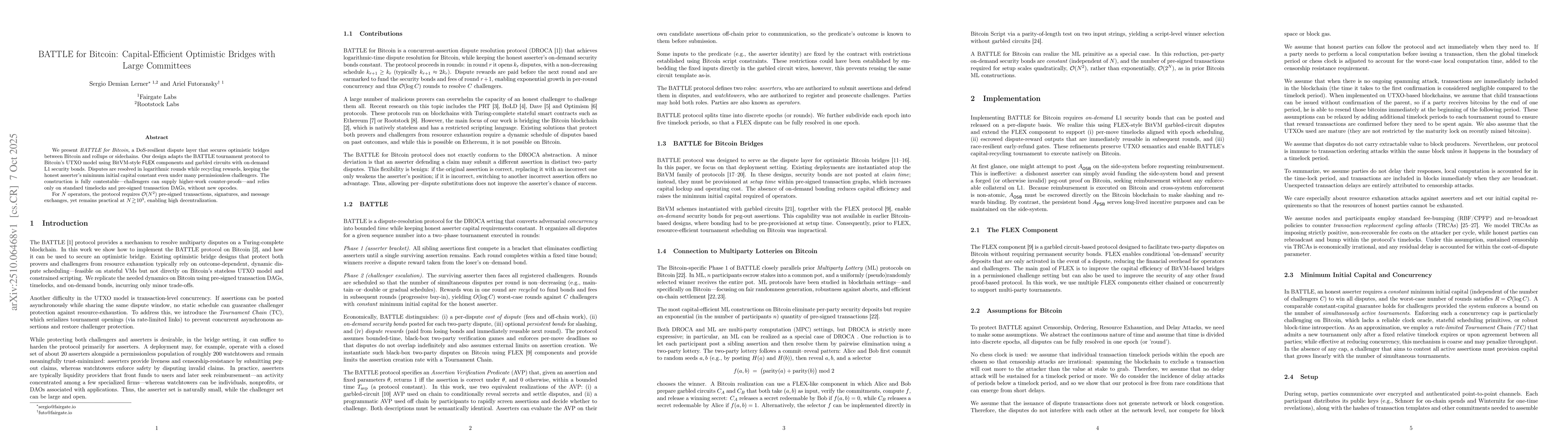 The research introduces BATTLE, a two-phase tournament mechanism for Bitcoin that leverages garbled circuits and on-demand security bonds to resolve disputes efficiently. It combines secure computation techniques with a structured challenge-response framework to enable logarithmic-round dispute resolution while maintaining constant capital for honest participants.