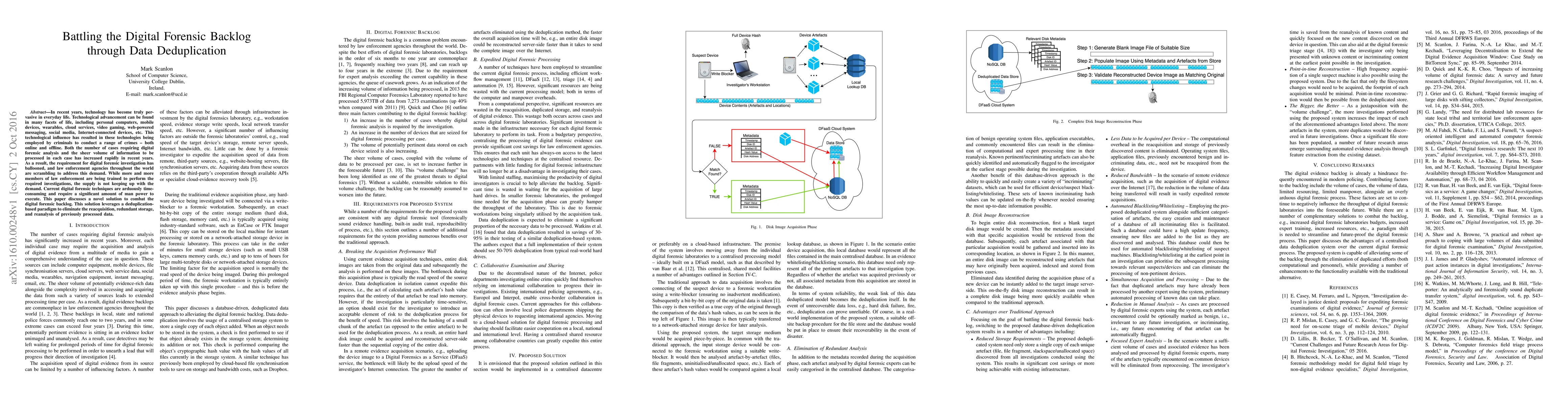 In everyday life. Technological advancement can be found in many facets of life, including personal computers, mobile devices, wearables, cloud services, video gaming, web-powered messaging, social media, Internet-connected devices, etc. This technological influence has resulted in these technologies being employed by criminals to conduct a range of crimes -- both online and offline. Both the number of cases requiring digital forensic analysis and the sheer volume of information to be processed in each case has increased rapidly in recent years. As a result, the requirement for digital forensic investigation has ballooned, and law enforcement agencies throughout the world are scrambling to address this demand. While more and more members of law enforcement are being trained to perform the required investigations, the supply is not keeping up with the demand. Current digital forensic techniques are arduously time-consuming and require a significant amount of man power to execute. This paper discusses a novel solution to combat the digital forensic backlog. This solution leverages a deduplication-based paradigm to eliminate the reacquisition, redundant storage, and reanalysis of previously processed data.