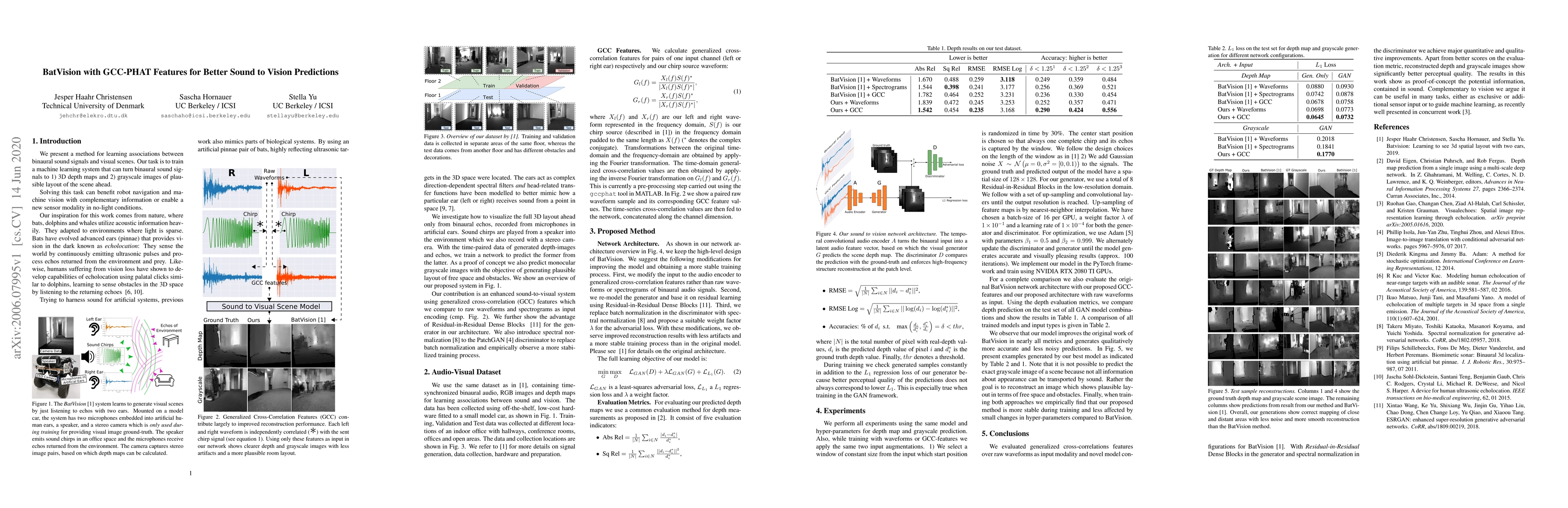 Inspired by sophisticated echolocation abilities found in nature, we train a generative adversarial network to predict plausible depth maps and grayscale layouts from sound. To achieve this, our sound-to-vision model processes binaural echo-returns from chirping sounds. We build upon previous work with BatVision that consists of a sound-to-vision model and a self-collected dataset using our mobile robot and low-cost hardware. We improve on the previous model by introducing several changes to the model, which leads to a better depth and grayscale estimation, and increased perceptual quality. Rather than using raw binaural waveforms as input, we generate generalized cross-correlation (GCC) features and use these as input instead. In addition, we change the model generator and base it on residual learning and use spectral normalization in the discriminator. We compare and present both quantitative and qualitative improvements over our previous BatVision model.