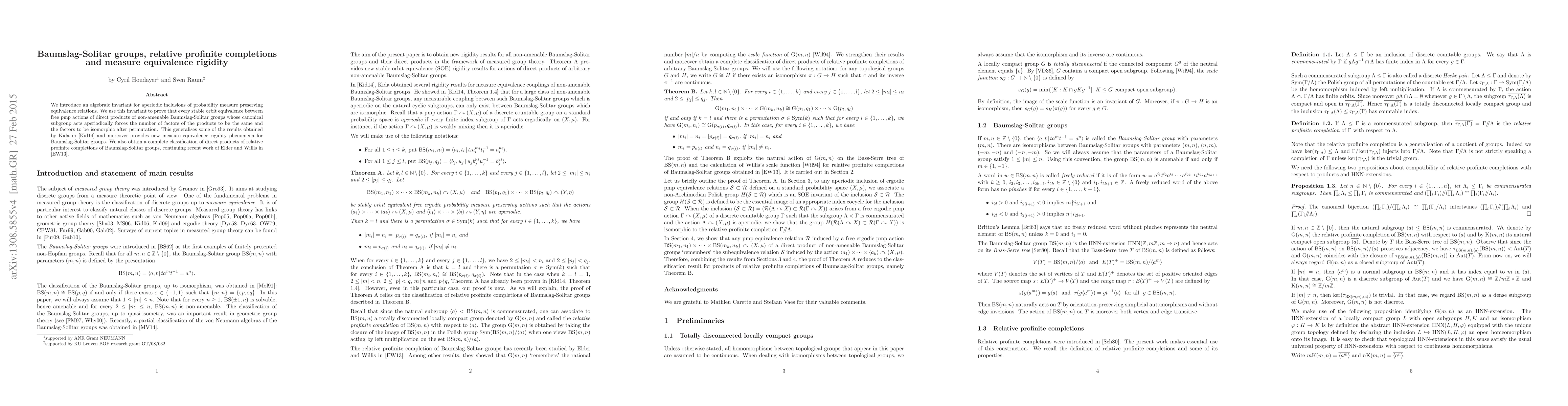 The paper introduces an algebraic invariant to demonstrate measure equivalence rigidity for stable orbit equivalences between free pmp actions of direct products of non-amenable Baumslag-Solitar groups, proving they must have the same number and isomorphic factors. It also classifies relative profinite completions of these groups.