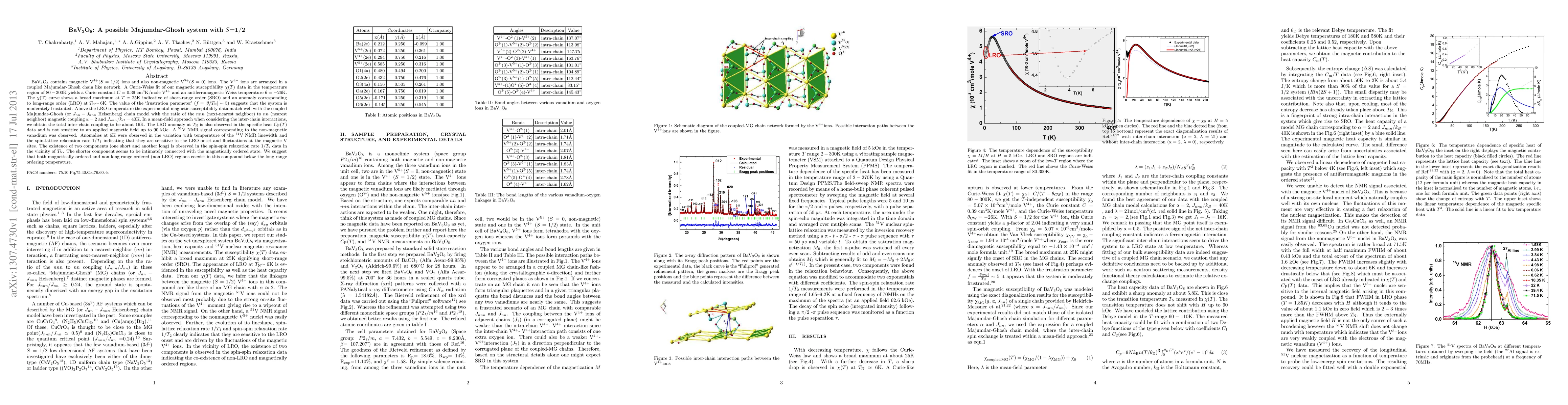 BaV3O8 exhibits a coupled Majumdar-Ghosh chain network of magnetic V4+(S=1/2) ions, displaying antiferromagnetic behavior and moderate frustration, with long-range order emerging at TN~6K. The compound's magnetic susceptibility and specific heat data support the presence of coexisting magnetically ordered and non-long-range ordered regions.