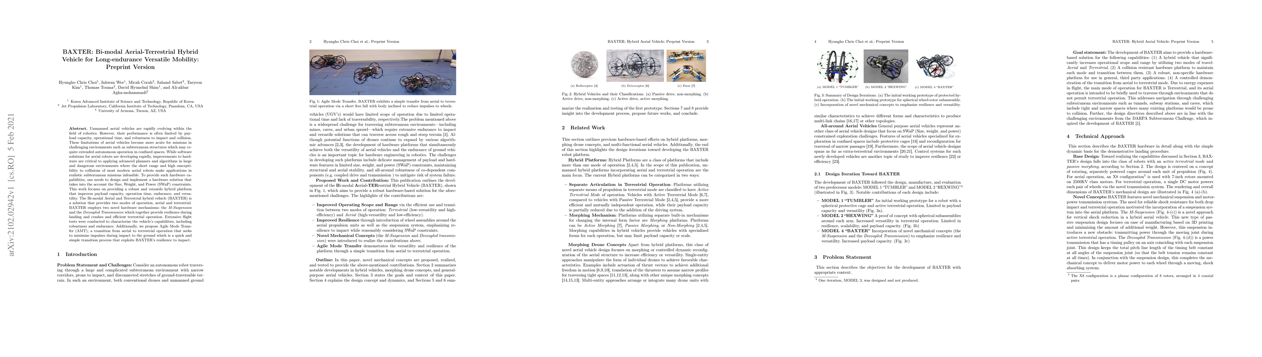 The BAXTER bi-modal aerial-terrestrial hybrid vehicle aims to enhance payload capacity, operational time, and robustness for missions in challenging environments. It employs innovative mechanisms like the M-Suspension and Decoupled Transmission for resilience and efficient terrestrial operation, along with Agile Mode Transfer for seamless transitions between aerial and terrestrial modes.