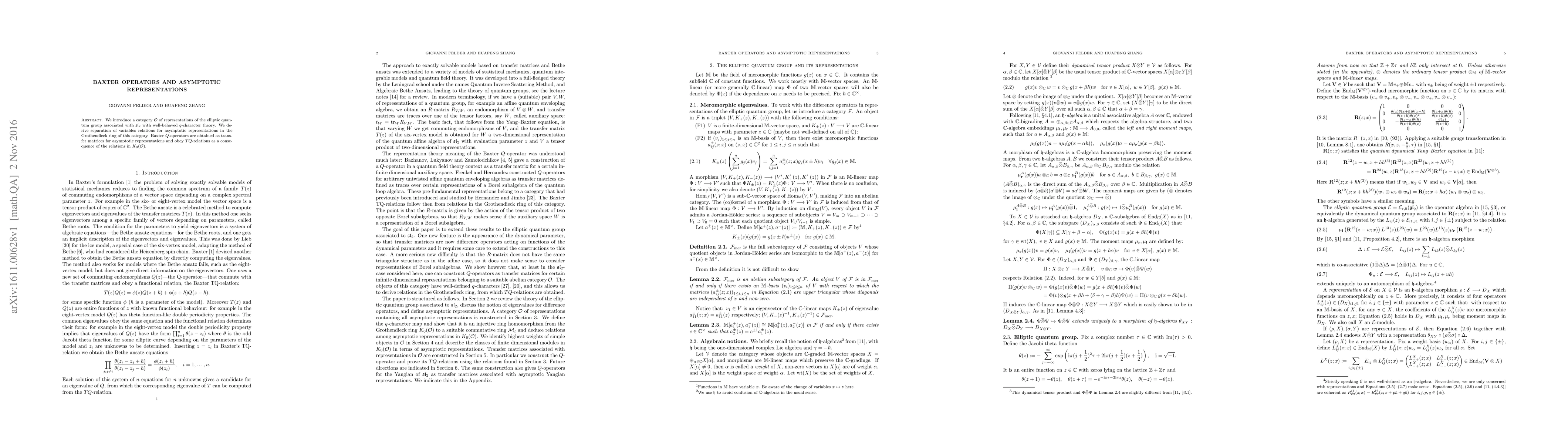 This paper introduces a category $\mathcal O$ of elliptic quantum group representations with $q$-character theory and derives separation of variables relations for asymptotic representations. Baxter $Q$-operators emerge as transfer matrices for these representations, satisfying $TQ$-relations due to the Grothendieck ring relations.