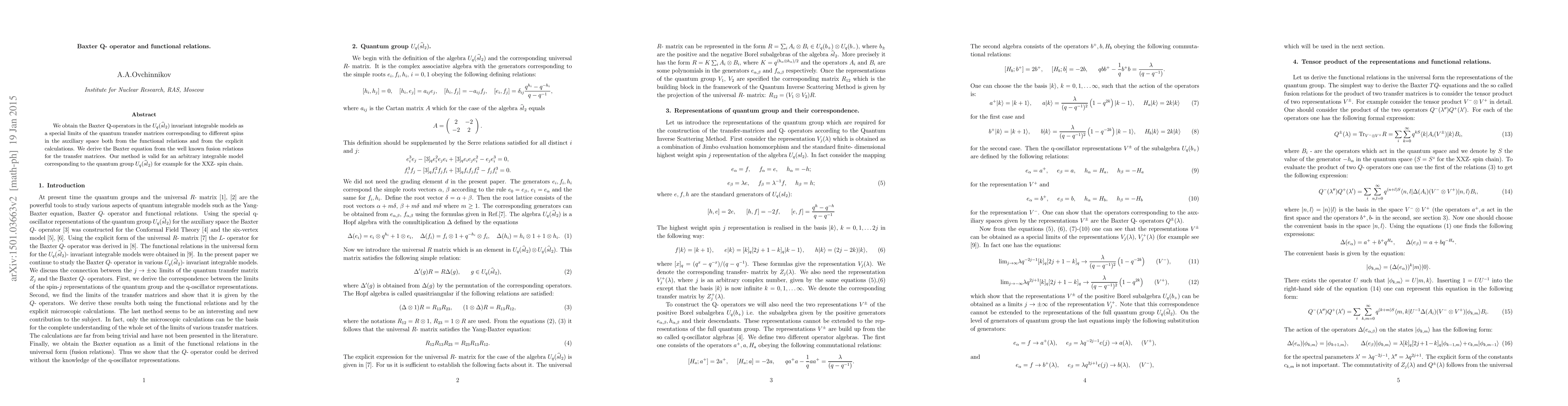 We obtain the Baxter Q-operators in the $U_q(\hat{sl}_2)$ invariant integrable models as a special limits of the quantum transfer matrices corresponding to different spins in the auxiliary space both from the functional relations and from the explicit calculations. We derive the Baxter equation from the well known fusion relations for the transfer matrices. Our method is valid for an arbitrary integrable model corresponding to the quantum group $U_q(\hat{sl}_2)$ for example for the XXZ- spin chain.