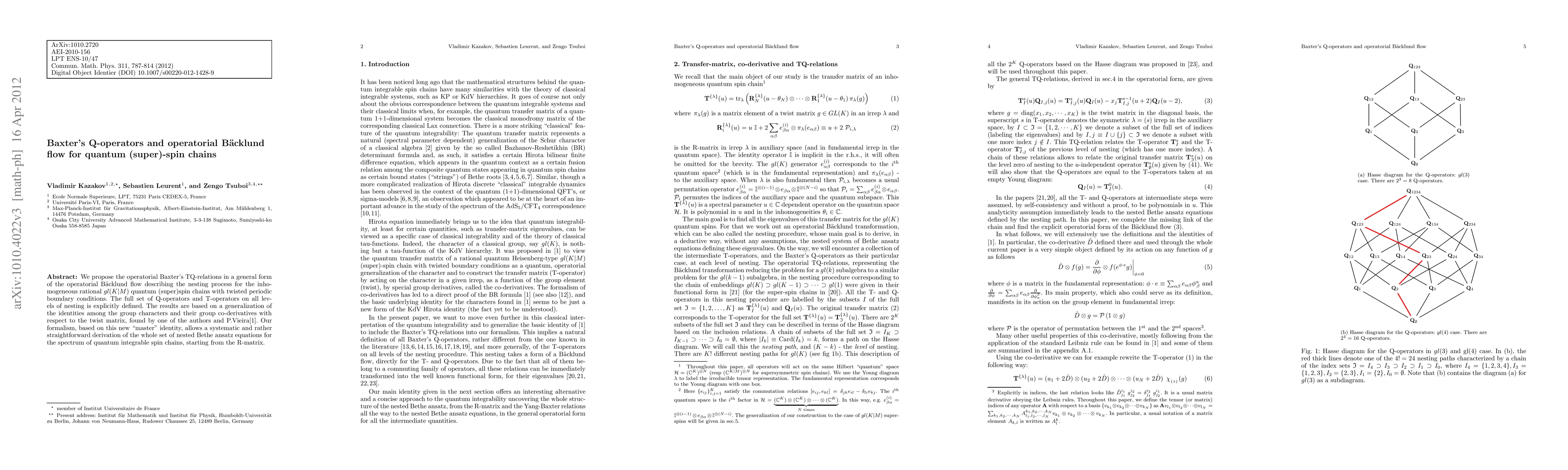 We propose the operatorial form of Baxter's TQ-relations in a general form of the operatorial B\"acklund flow describing the nesting process for the inhomogeneous rational gl(K|M) quantum (super)spin chains with twisted periodic boundary conditions. The full set of Q-operators and T-operators on all levels of nesting is explicitly defined. The results are based on a generalization of the identities among the group characters and their group co-derivatives with respect to the twist matrix, found by one of the authors and P.Vieira [V.Kazakov and P.Vieira, JHEP 0810 (2008) 050 [arXiv:0711.2470]]. Our formalism, based on this new "master" identity, allows a systematic and rather straightforward derivation of the whole set of nested Bethe ansatz equations for the spectrum of quantum integrable spin chains, starting from the R-matrix.