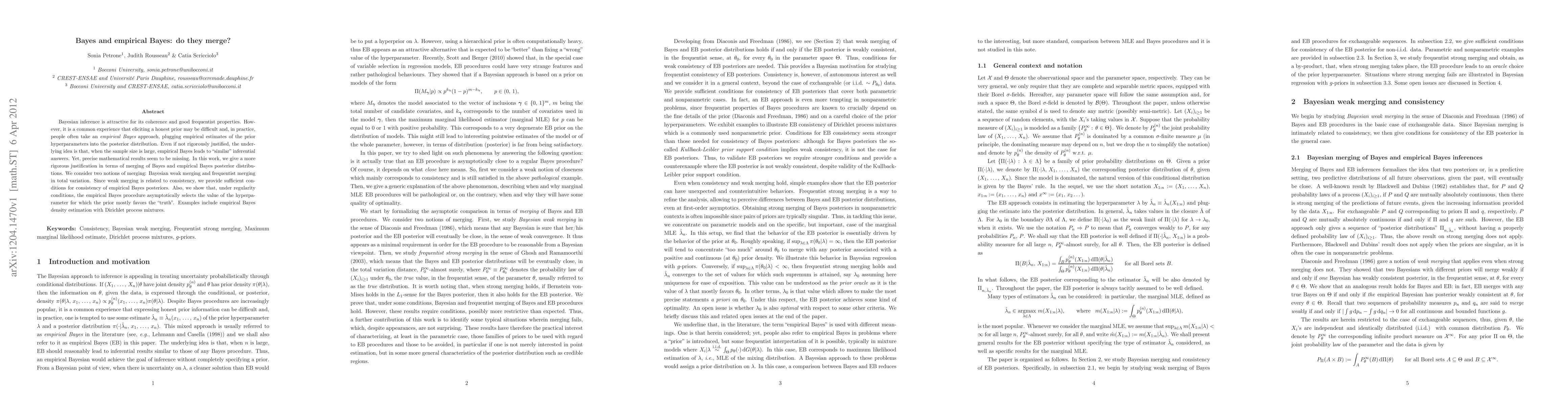 This paper rigorously justifies the merging of Bayesian and empirical Bayes approaches in terms of posterior distributions, providing conditions for consistency and frequentist merging. It demonstrates that empirical Bayes can asymptotically select hyperparameter values that favor the true parameter, exemplified through empirical Bayes density estimation with Dirichlet process mixtures.