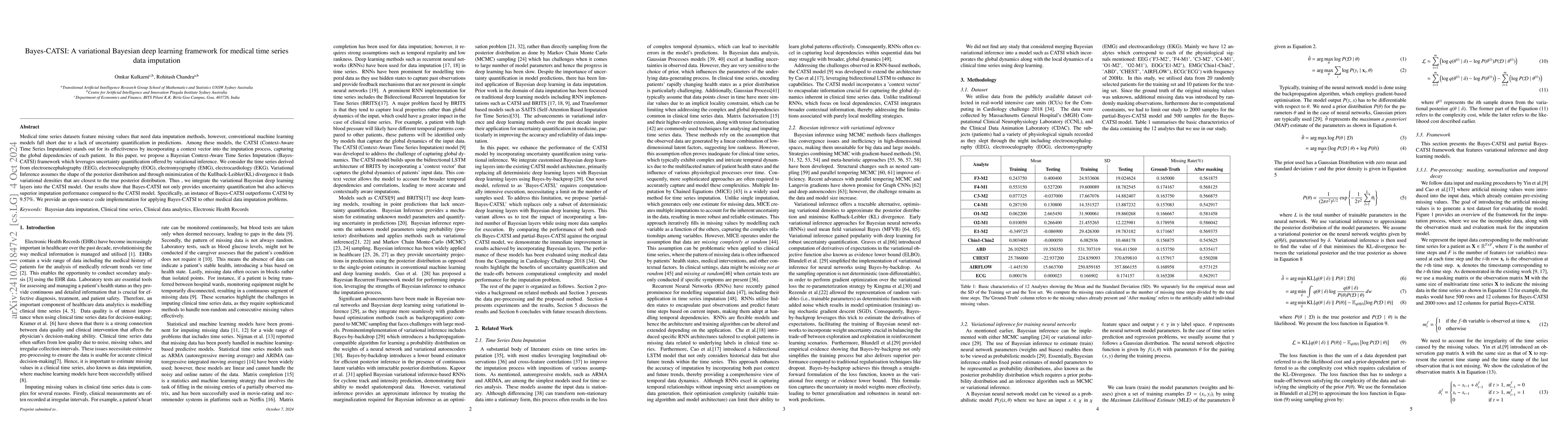 The paper introduces Bayes-CATSI, a variational Bayesian framework for medical time series data imputation that enhances the Context-Aware Time Series Imputation (CATSI) model with uncertainty quantification via variational inference, achieving superior performance with a 9.57% improvement over CATSI. An open-source implementation is provided for broader application.