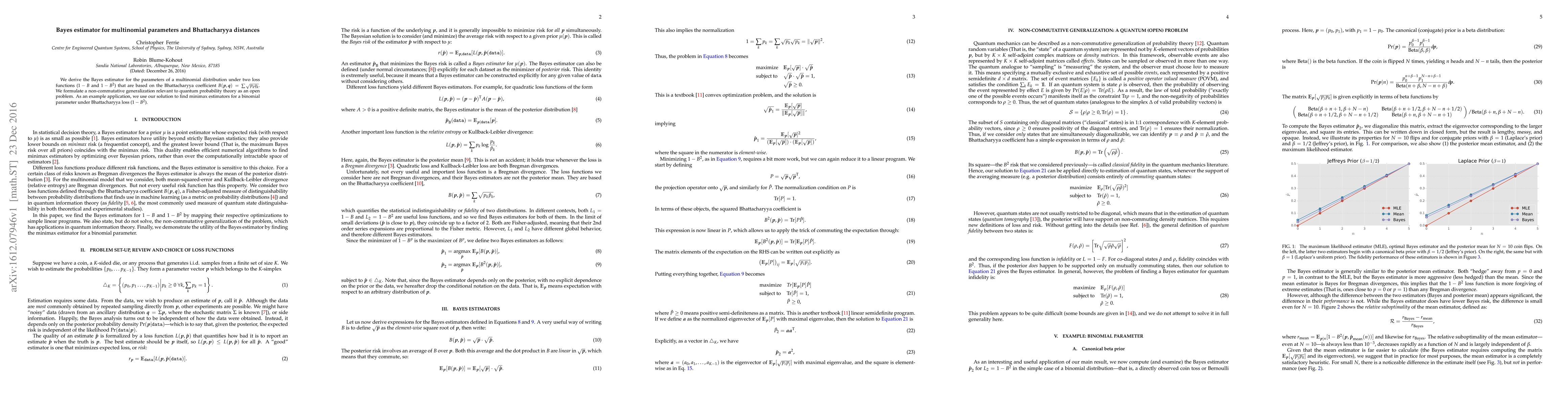 This paper derives Bayes estimators for multinomial distribution parameters under Bhattacharyya-based loss functions and explores their application in finding minimax estimators for binomial parameters. It also poses a non-commutative generalization relevant to quantum probability theory as an open research question.