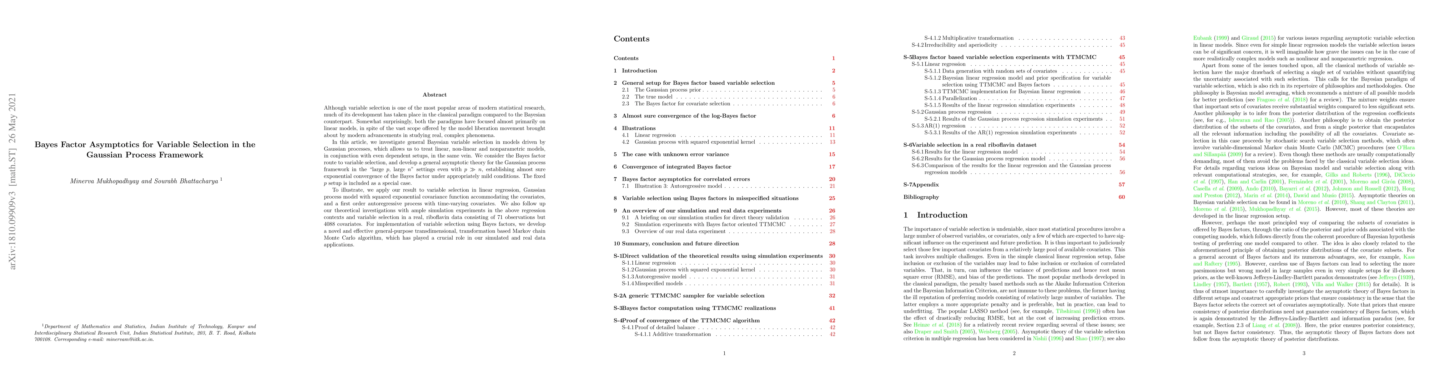 Although variable selection is one of the most popular areas of modern statistical research, much of its development has taken place in the classical paradigm compared to the Bayesian counterpart. Somewhat surprisingly, both the paradigms have focussed almost completely on linear models, in spite of the vast scope offered by the model liberation movement brought about by modern advancements in studying real, complex phenomena. In this article, we investigate general Bayesian variable selection in models driven by Gaussian processes, which allows us to treat linear, non-linear and nonparametric models, in conjunction with even dependent setups, in the same vein. We consider the Bayes factor route to variable selection, and develop a general asymptotic theory for the Gaussian process framework in the "large p, large n" settings even with p>>n, establishing almost sure exponential convergence of the Bayes factor under appropriately mild conditions. The fixed p setup is included as a special case. To illustrate, we apply our general result to variable selection in linear regression, Gaussian process model with squared exponential covariance function accommodating the covariates, and a first order autoregressive process with time-varying covariates. We also follow up our theoretical investigations with ample simulation experiments in the above regression contexts and variable selection in a real, riboflavin data consisting of 71 observations but 4088 covariates. For implementation of variable selection using Bayes factors, we develop a novel and effective general-purpose transdimensional, transformation based Markov chain Monte Carlo algorithm, which has played a crucial role in our simulated and real data applications.