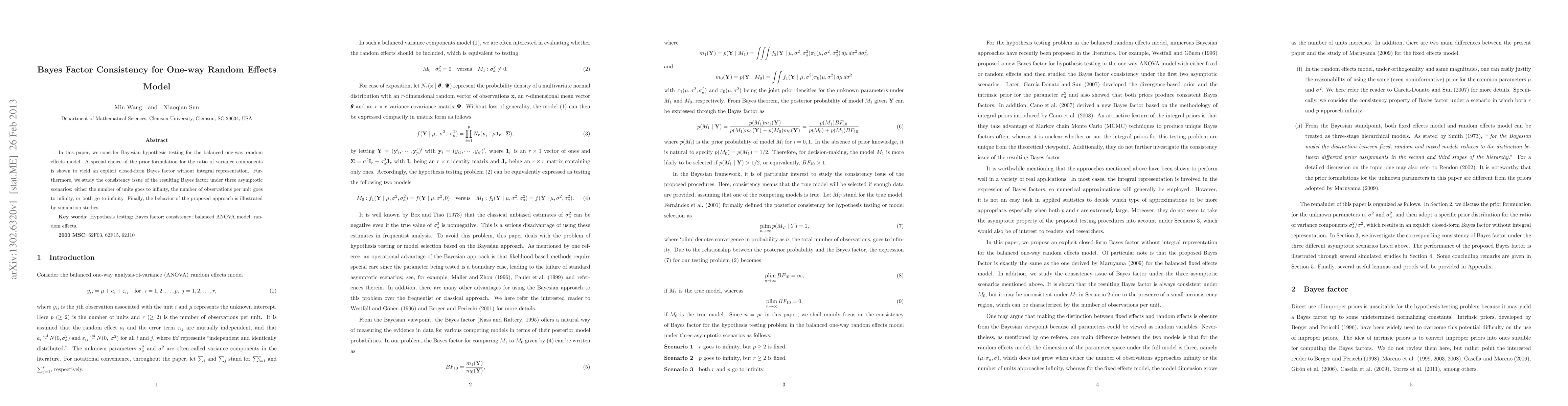 This paper develops a closed-form Bayes factor for balanced one-way random effects models and examines its consistency under various asymptotic scenarios, concluding with simulation studies to demonstrate its behavior.