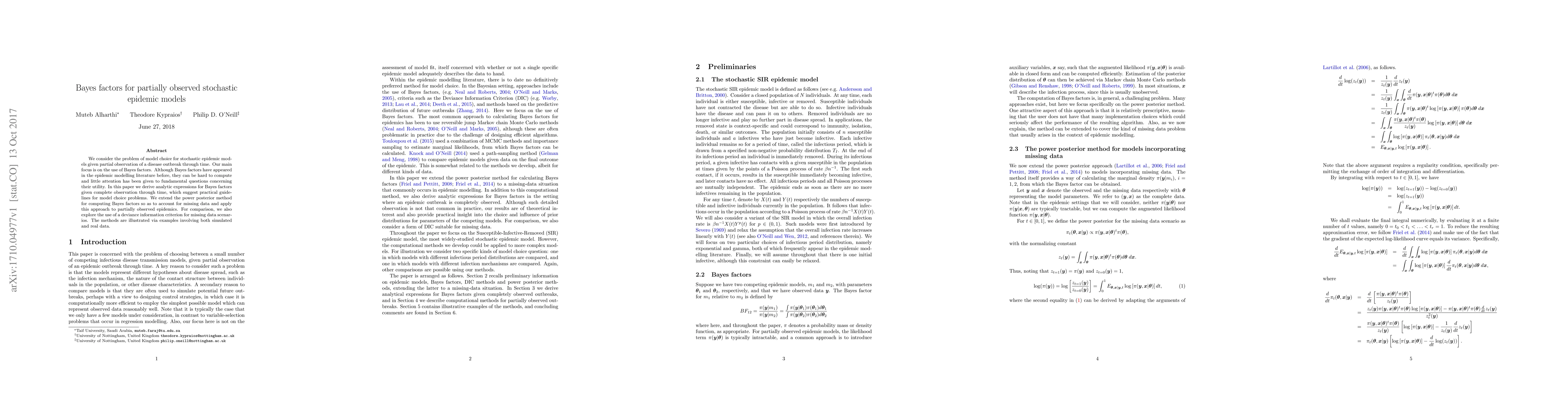 This paper develops analytic expressions for Bayes factors to aid in model choice for stochastic epidemic models with partial observations, extending the power posterior method to handle missing data. It also compares these methods with a deviance information criterion, demonstrating their application through simulated and real data examples.