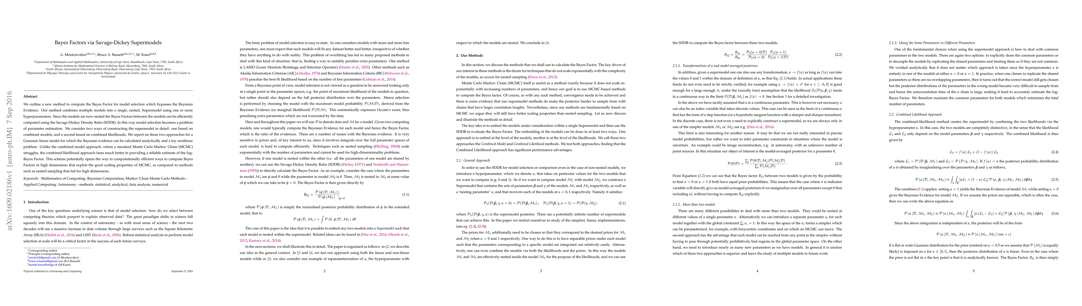 We outline a new method to compute the Bayes Factor for model selection which bypasses the Bayesian Evidence. Our method combines multiple models into a single, nested, Supermodel using one or more hyperparameters. Since the models are now nested the Bayes Factors between the models can be efficiently computed using the Savage-Dickey Density Ratio (SDDR). In this way model selection becomes a problem of parameter estimation. We consider two ways of constructing the supermodel in detail: one based on combined models, and a second based on combined likelihoods. We report on these two approaches for a Gaussian linear model for which the Bayesian evidence can be calculated analytically and a toy nonlinear problem. Unlike the combined model approach, where a standard Monte Carlo Markov Chain (MCMC) struggles, the combined-likelihood approach fares much better in providing a reliable estimate of the log-Bayes Factor. This scheme potentially opens the way to computationally efficient ways to compute Bayes Factors in high dimensions that exploit the good scaling properties of MCMC, as compared to methods such as nested sampling that fail for high dimensions.
