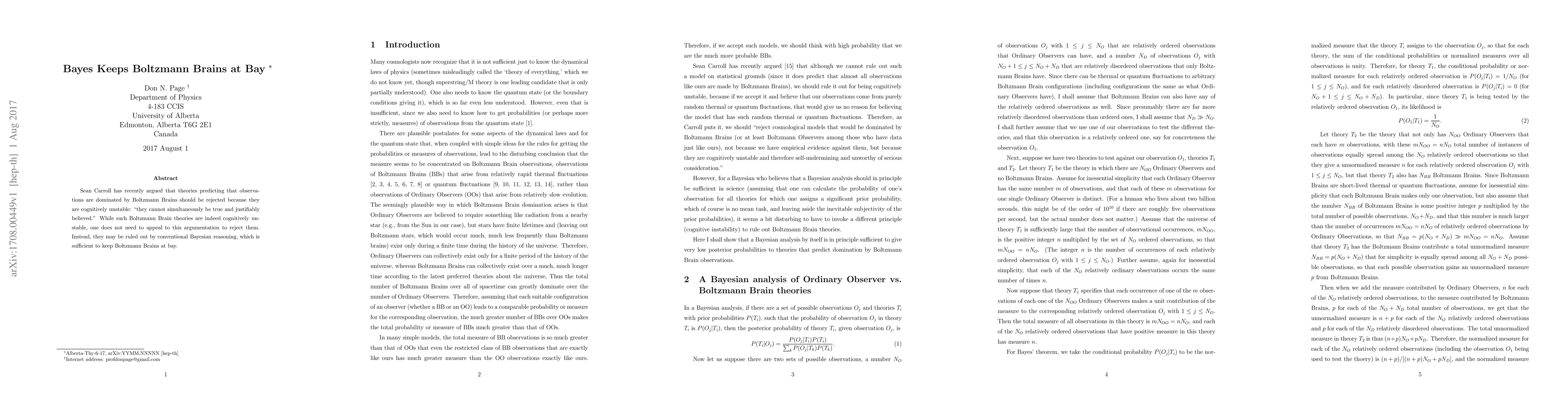 Sean Carroll has recently argued that theories predicting that observations are dominated by Boltzmann Brains should be rejected because they are cognitively unstable: "they cannot simultaneously be true and justifiably believed." While such Boltzmann Brain theories are indeed cognitively unstable, one does not need to appeal to this argumentation to reject them. Instead, they may be ruled out by conventional Bayesian reasoning, which is sufficient to keep Boltzmann Brains at bay.