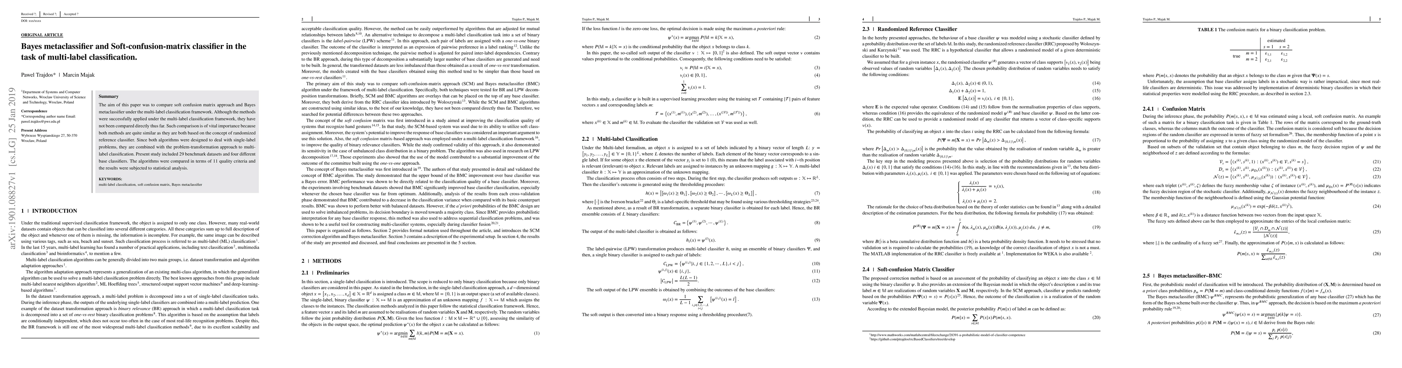 This paper compares the soft confusion matrix approach and Bayes metaclassifier for multi-label classification, employing 29 benchmark datasets and four base classifiers. The study evaluates both methods using 11 quality criteria and performs statistical analysis to determine their relative effectiveness.