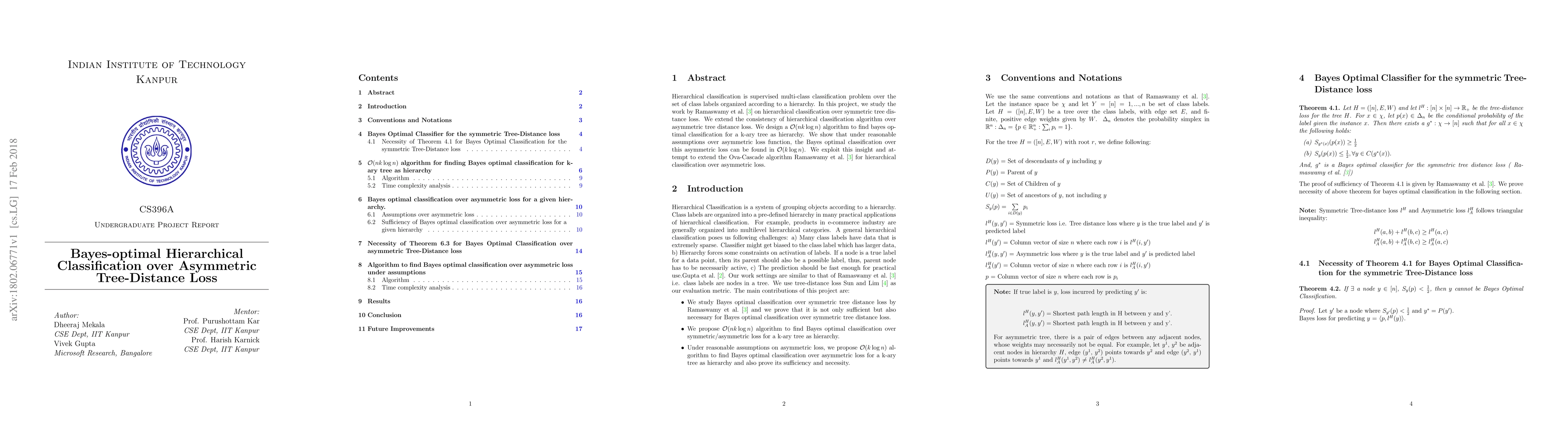 Hierarchical classification is supervised multi-class classification problem over the set of class labels organized according to a hierarchy. In this report, we study the work by Ramaswamy et. al. on hierarchical classification over symmetric tree distance loss. We extend the consistency of hierarchical classification algorithm over asymmetric tree distance loss. We design a $\mathcal{O}(nk\log{}n)$ algorithm to find Bayes optimal classification for a k-ary tree as a hierarchy. We show that under reasonable assumptions over asymmetric loss function, the Bayes optimal classification over this asymmetric loss can be found in $\mathcal{O}(k\log{}n)$. We exploit this insight and attempt to extend the Ova-Cascade algorithm \citet{ramaswamy2015convex} for hierarchical classification over the asymmetric loss.
