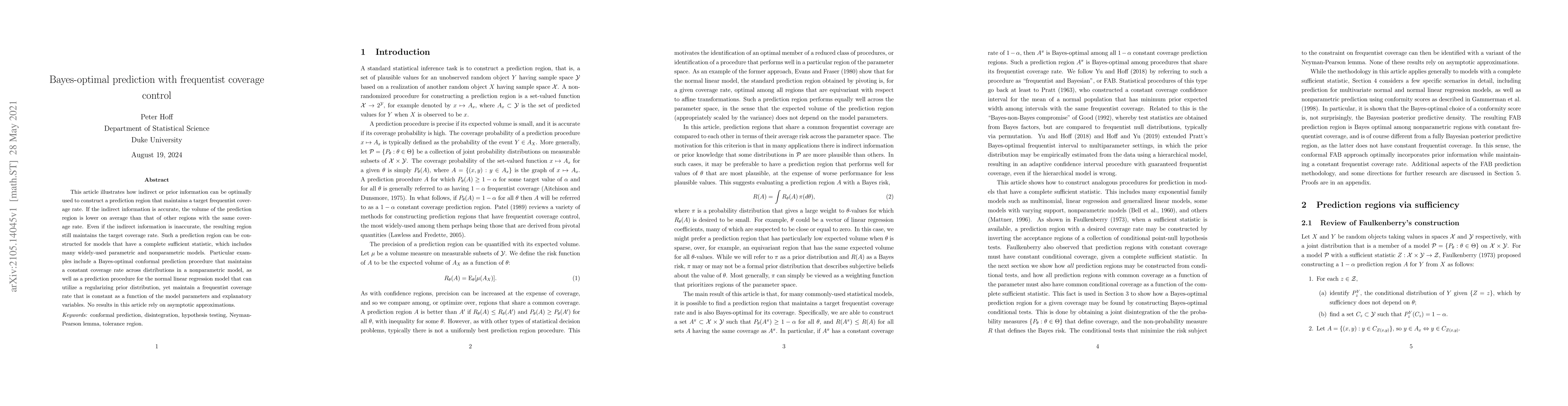 This article illustrates how indirect or prior information can be optimally used to construct a prediction region that maintains a target frequentist coverage rate. If the indirect information is accurate, the volume of the prediction region is lower on average than that of other regions with the same coverage rate. Even if the indirect information is inaccurate, the resulting region still maintains the target coverage rate. Such a prediction region can be constructed for models that have a complete sufficient statistic, which includes many widely-used parametric and nonparametric models. Particular examples include a Bayes-optimal conformal prediction procedure that maintains a constant coverage rate across distributions in a nonparametric model, as well as a prediction procedure for the normal linear regression model that can utilize a regularizing prior distribution, yet maintain a frequentist coverage rate that is constant as a function of the model parameters and explanatory variables. No results in this article rely on asymptotic approximations.