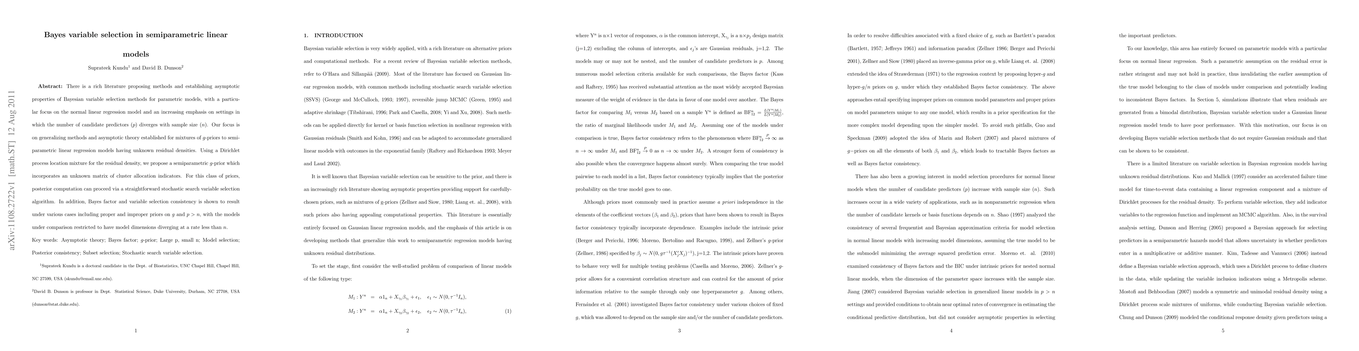 This paper proposes a semiparametric Bayesian variable selection method for linear regression models with unknown residual densities, utilizing a Dirichlet process location mixture and a semiparametric $g$-prior. The method ensures Bayes factor consistency and variable selection consistency even when the number of predictors exceeds the sample size.