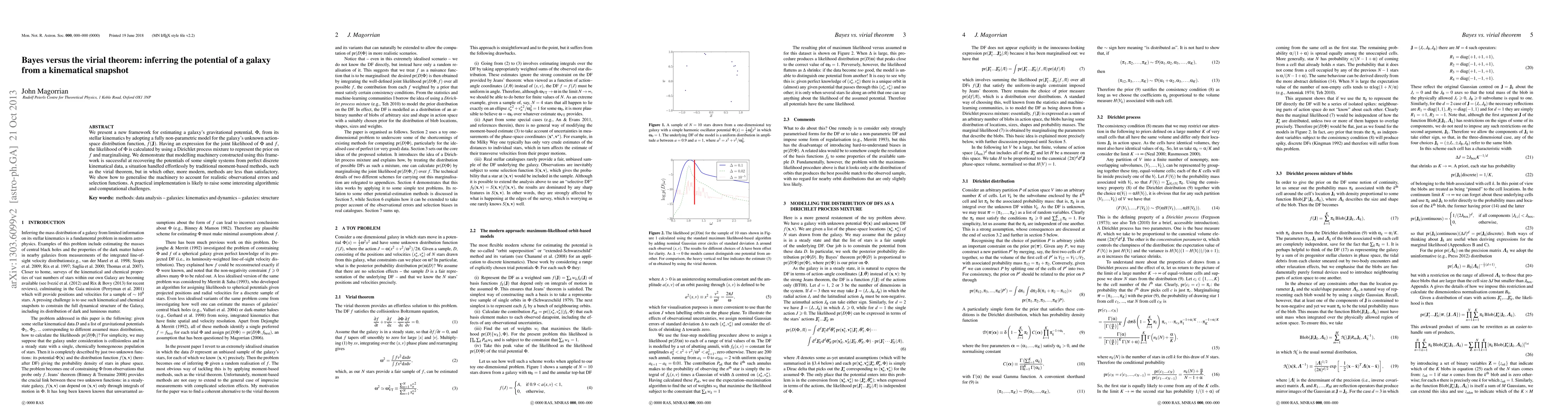 We present a new framework for estimating a galaxy's gravitational potential, Phi(x), from its stellar kinematics by adopting a fully non-parametric model for the galaxy's unknown action-space distribution function, f(J). Having an expression for the joint likelihood of Phi and f, the likelihood of Phi is calculated by using a Dirichlet process mixture to represent the prior on f and marginalising. We demonstrate that modelling machinery constructed using this framework is successful at recovering the potentials of some simple systems from perfect discrete kinematical data, a situation handled effortlessly by traditional moment-based methods, such as the virial theorem, but in which other, more modern, methods are less than satisfactory. We show how to generalise the machinery to account for realistic observational errors and selection functions. A practical implementation is likely to raise some interesting algorithmic and computational challenges.