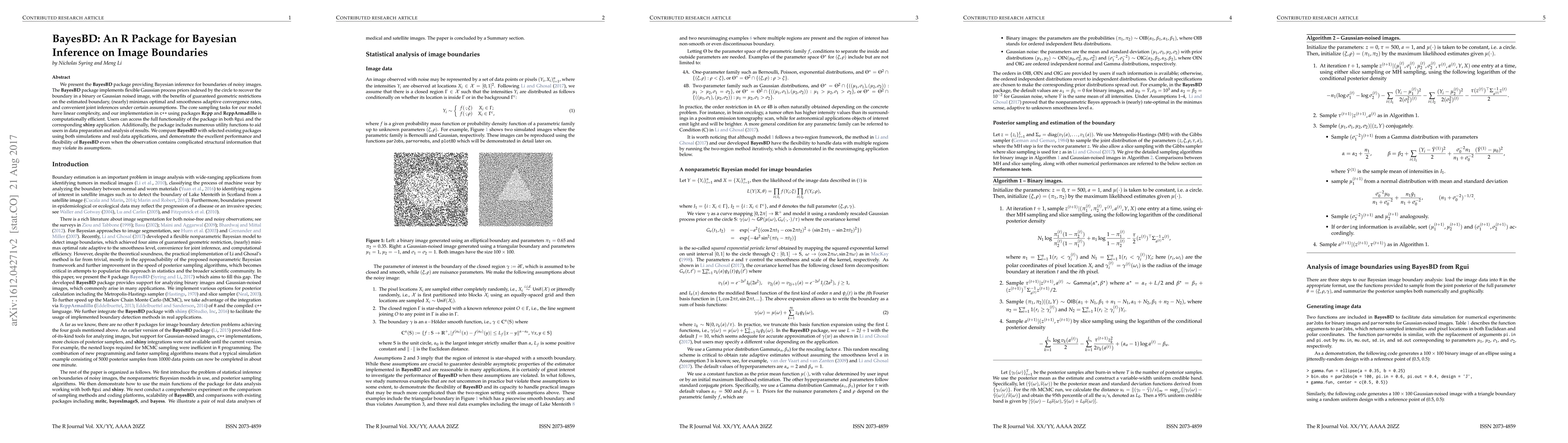 BayesBD is an R package for Bayesian inference on image boundaries, utilizing Gaussian process priors to recover boundaries in noisy images with optimal convergence rates and geometric restrictions. The package is efficient and includes a Shiny application for user interaction, along with utility functions for data preparation and analysis.