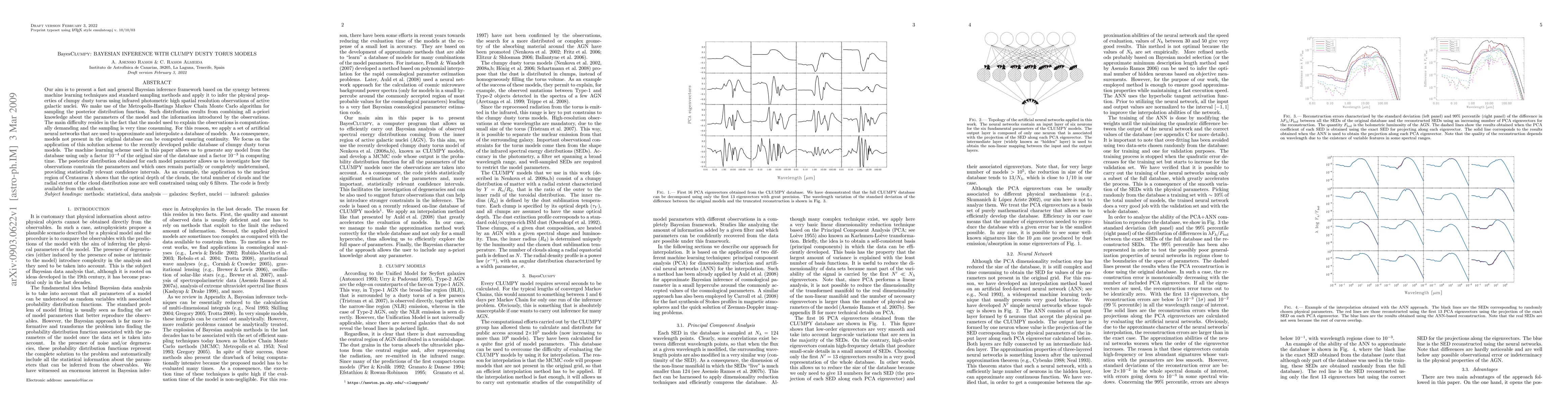 Our aim is to present a fast and general Bayesian inference framework based on the synergy between machine learning techniques and standard sampling methods and apply it to infer the physical properties of clumpy dusty torus using infrared photometric high spatial resolution observations of active galactic nuclei. We make use of the Metropolis-Hastings Markov Chain Monte Carlo algorithm for sampling the posterior distribution function. Such distribution results from combining all a-priori knowledge about the parameters of the model and the information introduced by the observations. The main difficulty resides in the fact that the model used to explain the observations is computationally demanding and the sampling is very time consuming. For this reason, we apply a set of artificial neural networks that are used to approximate and interpolate a database of models. As a consequence, models not present in the original database can be computed ensuring continuity. We focus on the application of this solution scheme to the recently developed public database of clumpy dusty torus models. The machine learning scheme used in this paper allows us to generate any model from the database using only a factor 10^-4 of the original size of the database and a factor 10^-3 in computing time. The posterior distribution obtained for each model parameter allows us to investigate how the observations constrain the parameters and which ones remain partially or completely undetermined, providing statistically relevant confidence intervals. As an example, the application to the nuclear region of Centaurus A shows that the optical depth of the clouds, the total number of clouds and the radial extent of the cloud distribution zone are well constrained using only 6 filters.