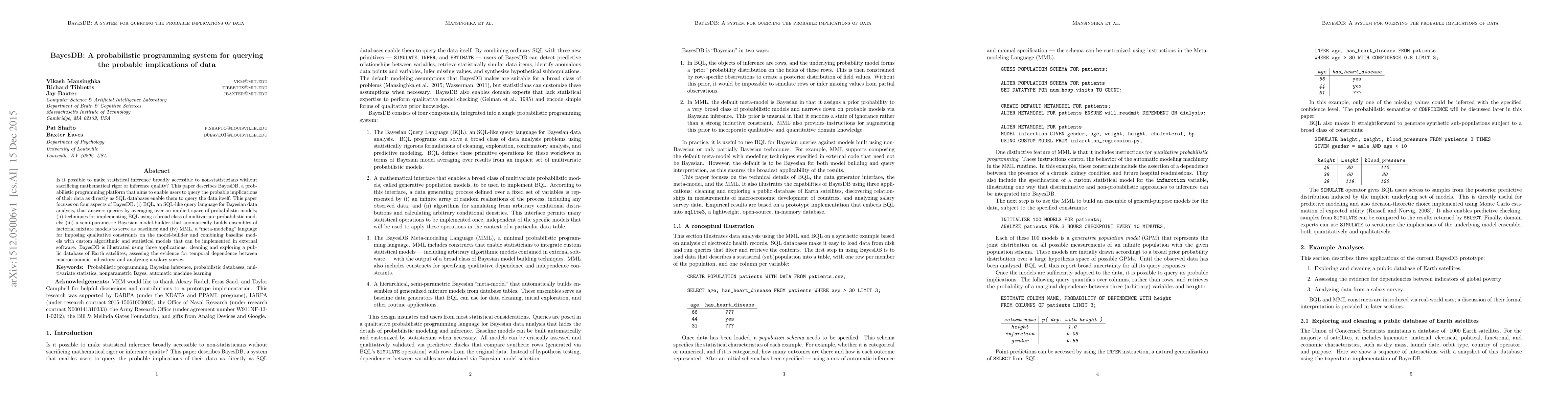 BayesDB is a probabilistic programming system designed to make Bayesian data analysis accessible to non-statisticians through an SQL-like query language. It employs BQL, semi-parametric model-builders, and a meta-modeling language to facilitate inference without sacrificing rigor.