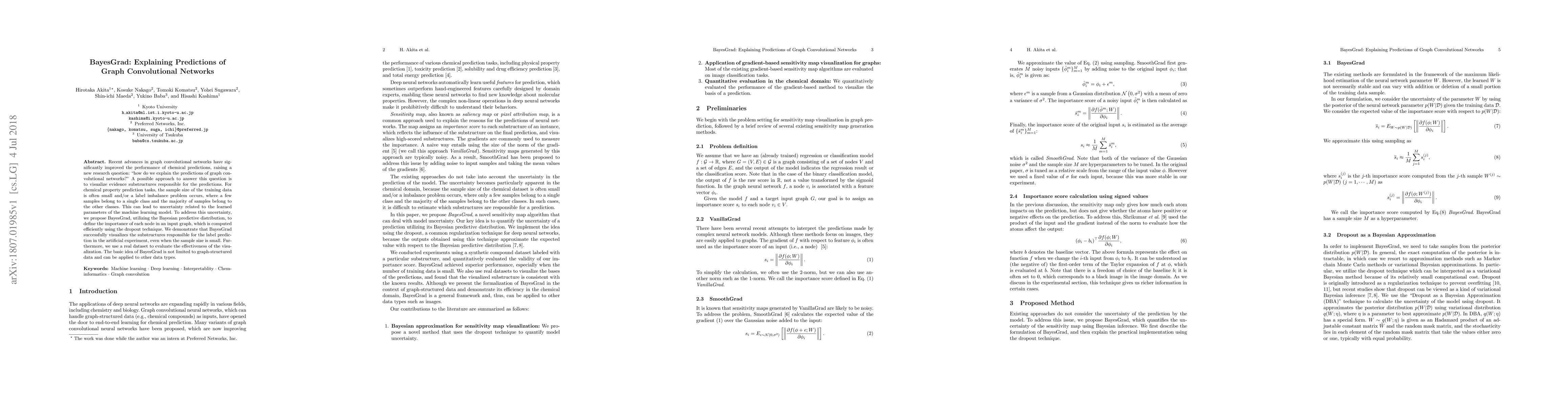 Recent advances in graph convolutional networks have significantly improved the performance of chemical predictions, raising a new research question: "how do we explain the predictions of graph convolutional networks?" A possible approach to answer this question is to visualize evidence substructures responsible for the predictions. For chemical property prediction tasks, the sample size of the training data is often small and/or a label imbalance problem occurs, where a few samples belong to a single class and the majority of samples belong to the other classes. This can lead to uncertainty related to the learned parameters of the machine learning model. To address this uncertainty, we propose BayesGrad, utilizing the Bayesian predictive distribution, to define the importance of each node in an input graph, which is computed efficiently using the dropout technique. We demonstrate that BayesGrad successfully visualizes the substructures responsible for the label prediction in the artificial experiment, even when the sample size is small. Furthermore, we use a real dataset to evaluate the effectiveness of the visualization. The basic idea of BayesGrad is not limited to graph-structured data and can be applied to other data types.