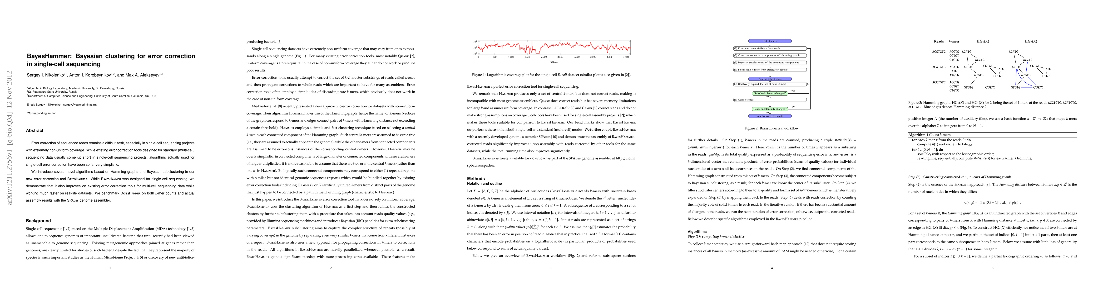 BayesHammer introduces novel Bayesian clustering algorithms for error correction in single-cell sequencing, leveraging Hamming graphs and subclustering to improve accuracy and speed. It outperforms existing tools for both single-cell and multi-cell sequencing data, as demonstrated through $k$-mer counts and SPAdes genome assembler.