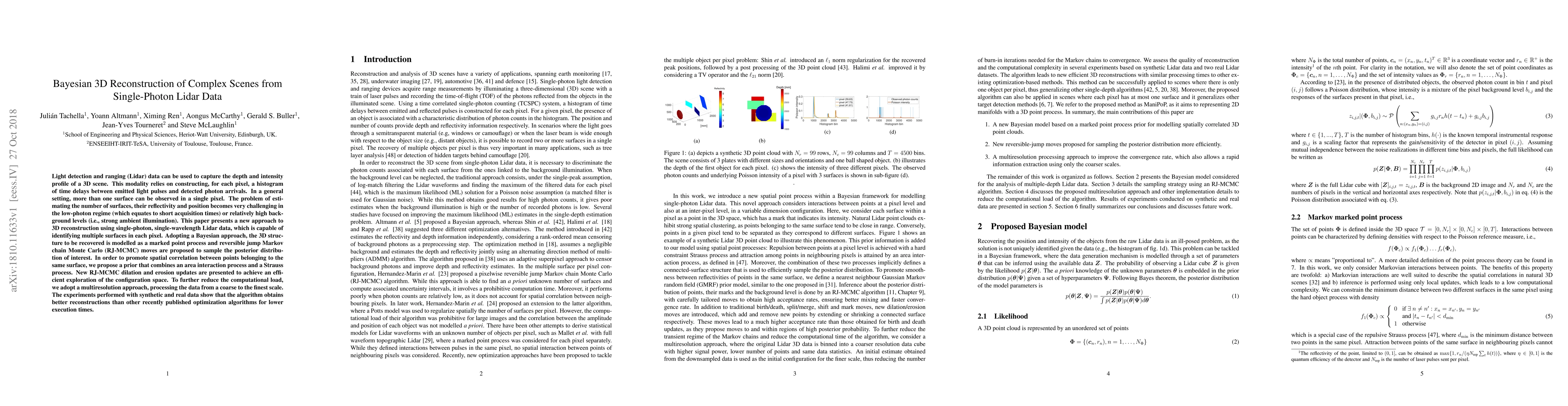 This paper introduces a Bayesian method for reconstructing 3D scenes from single-photon Lidar data, addressing the challenges of identifying multiple surfaces in low-photon regimes. The approach uses reversible jump MCMC and a multiresolution strategy to efficiently model and reconstruct complex scenes, achieving better results than other algorithms.