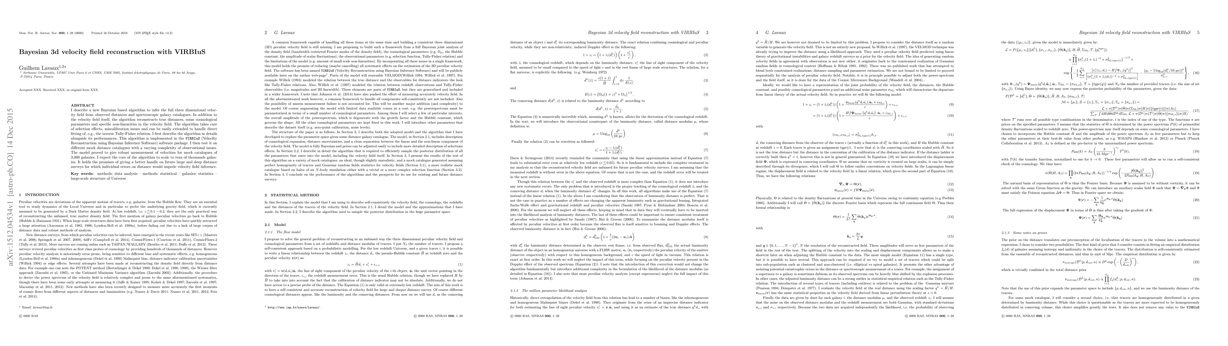 I describe a new Bayesian based algorithm to infer the full three dimensional velocity field from observed distances and spectroscopic galaxy catalogues. In addition to the velocity field itself, the algorithm reconstructs true distances, some cosmological parameters and specific non-linearities in the velocity field. The algorithm takes care of selection effects, miscalibration issues and can be easily extended to handle direct fitting of, e.g., the inverse Tully-Fisher relation. I first describe the algorithm in details alongside its performances. This algorithm is implemented in the VIRBIuS (VelocIty Reconstruction using Bayesian Inference Software) software package. I then test it on different mock distance catalogues with a varying complexity of observational issues. The model proved to give robust measurement of velocities for mock catalogues of 3,000 galaxies. I expect the core of the algorithm to scale to tens of thousands galaxies. It holds the promises of giving a better handle on future large and deep distance surveys for which individual errors on distance would impede velocity field inference.