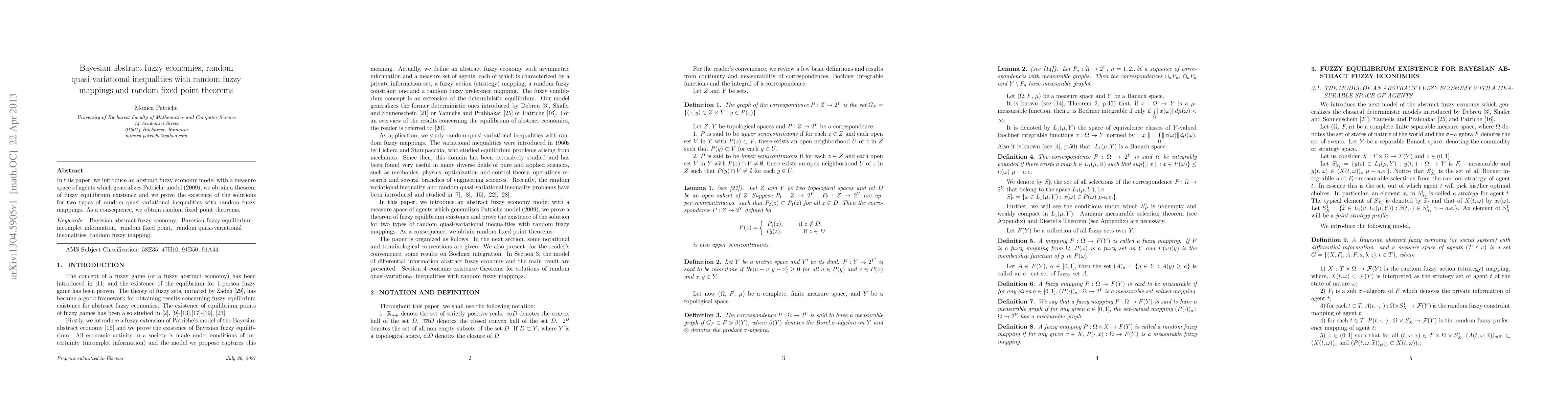 This paper develops a generalized abstract fuzzy economy model with a measure space of agents, proving the existence of fuzzy equilibrium and solutions for random quasi-variational inequalities with random fuzzy mappings, leading to the establishment of random fixed point theorems.