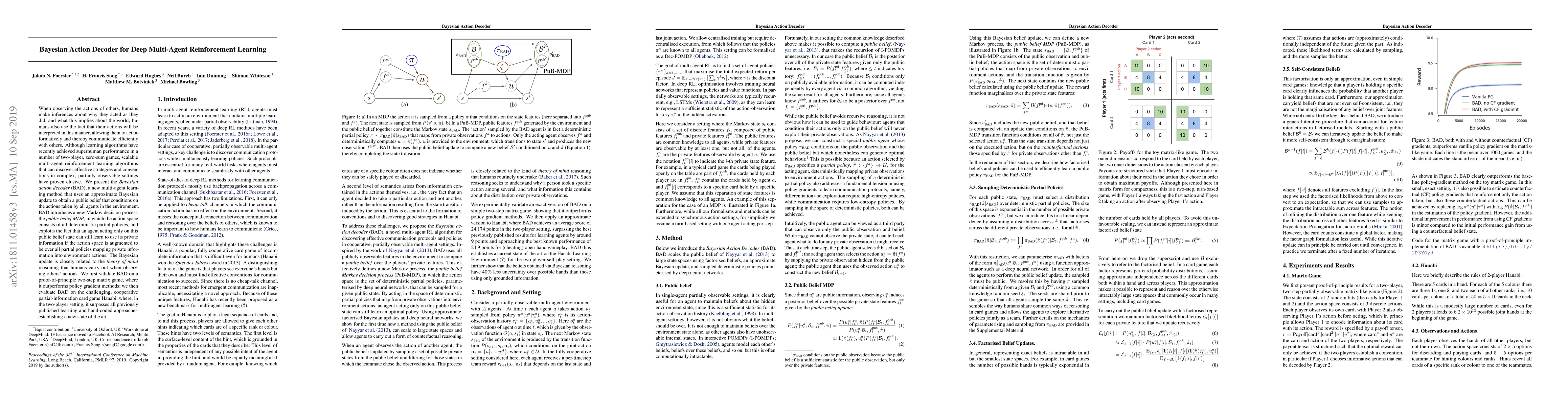 The paper introduces the Bayesian action decoder (BAD), a novel multi-agent reinforcement learning method that employs an approximate Bayesian update to infer public beliefs from observed actions. BAD outperforms existing methods in complex, cooperative settings like the Hanabi card game, demonstrating its potential for scalable multi-agent learning.