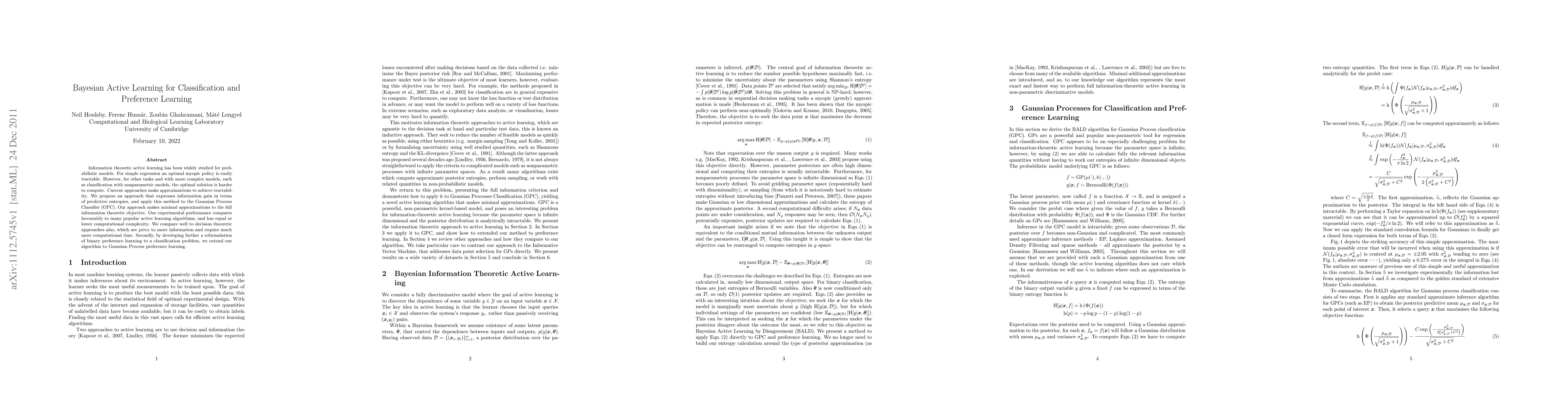 This paper proposes a Bayesian active learning approach for classification using Gaussian Process Classifiers, minimizing approximations to the full information theoretic objective. The method also extends to Gaussian Process preference learning, demonstrating competitive performance against other active learning algorithms.