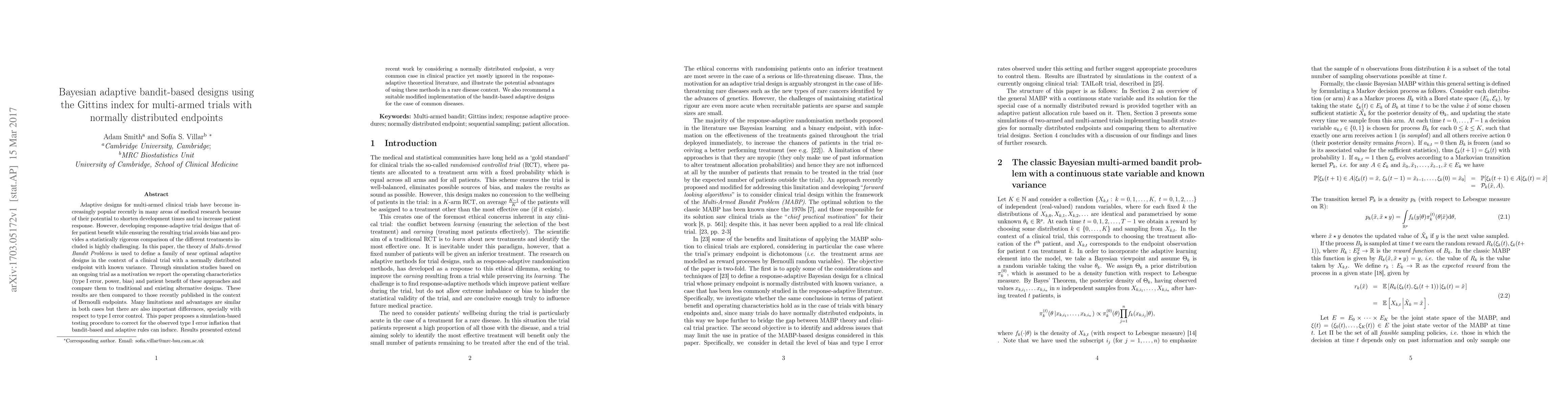 This paper proposes Bayesian adaptive bandit-based designs using the Gittins index for multi-armed clinical trials with normally distributed endpoints, addressing challenges in maintaining statistical rigor while ensuring patient benefit. Simulation studies show these designs outperform traditional methods, though they require a correction procedure to manage type I error inflation.