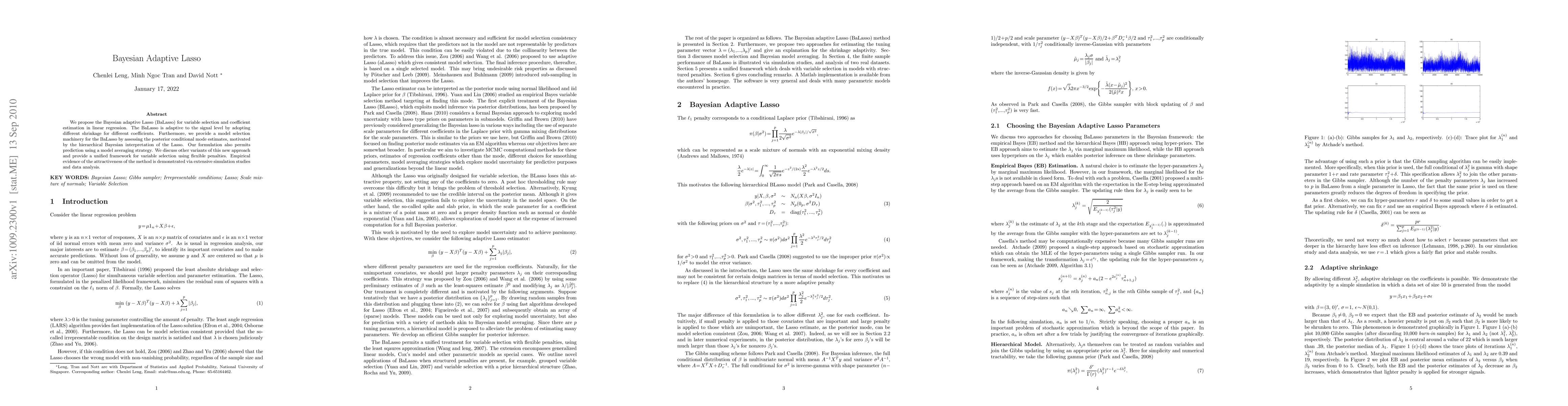 The Bayesian adaptive Lasso (BaLasso) is proposed for adaptive variable selection and coefficient estimation in linear regression, employing different shrinkage levels for coefficients. It includes a model selection mechanism and allows for prediction via model averaging, supported by simulation studies and data analysis.