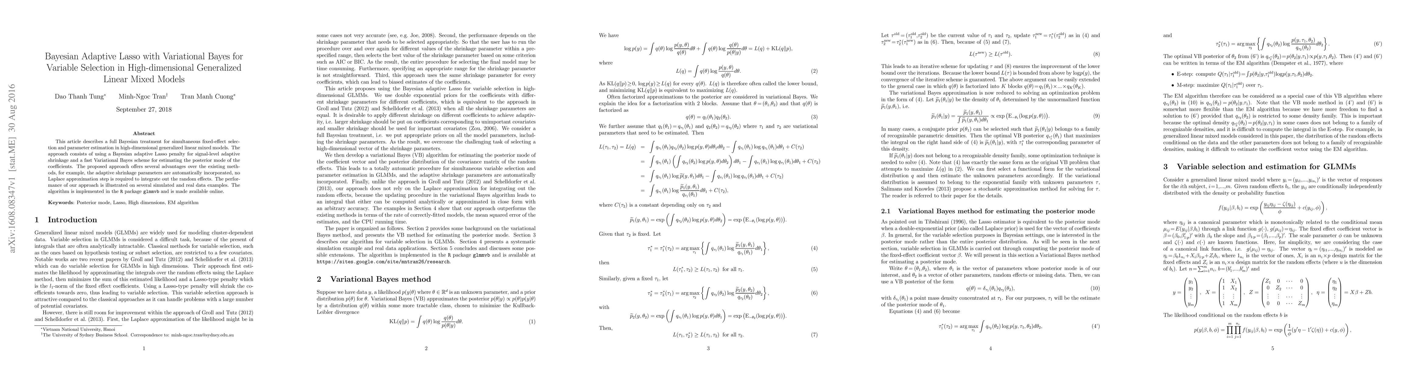 This paper proposes a Bayesian adaptive Lasso with Variational Bayes for variable selection in high-dimensional generalized linear mixed models, offering adaptive shrinkage and efficient posterior estimation without Laplace approximation. The method is implemented in the R package glmmvb and demonstrated through simulated and real data examples.