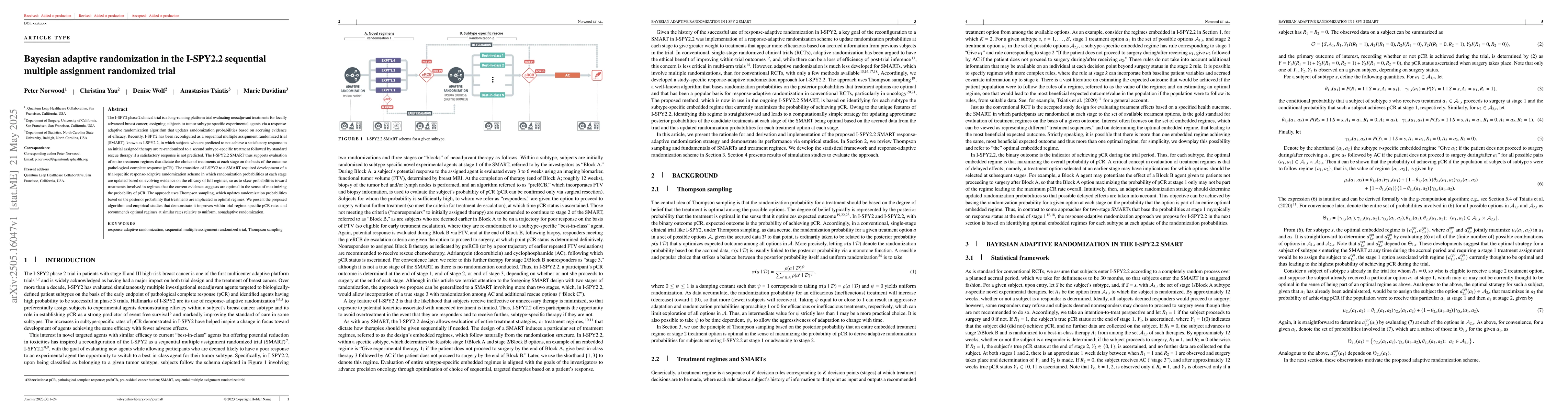 The research describes the development of a trial-specific response-adaptive randomization scheme for the I-SPY2.2 SMART, which updates randomization probabilities based on evolving evidence on treatment regime efficacy using Thompson sampling.