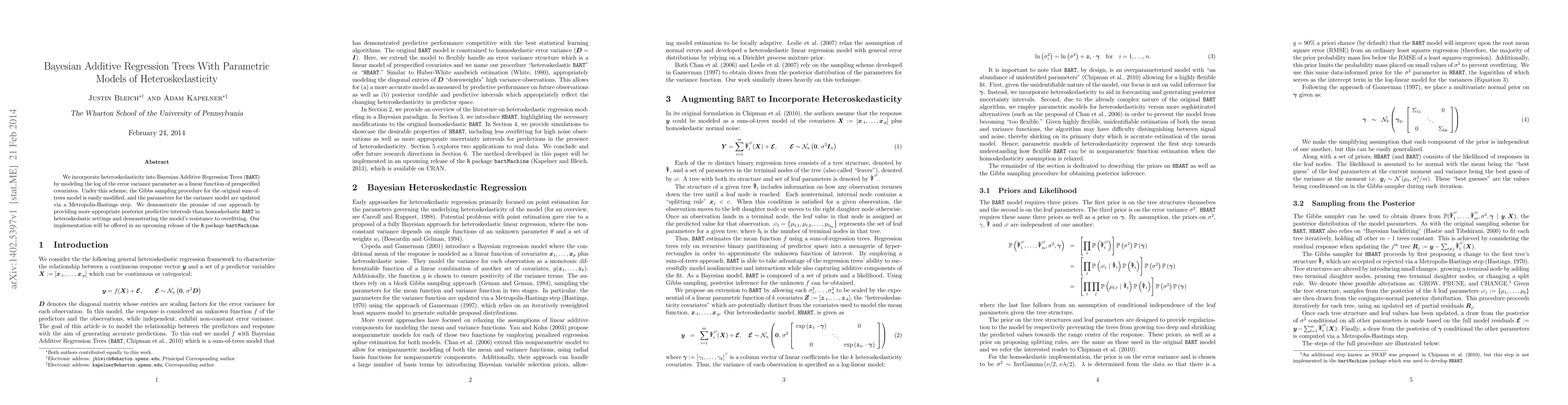 This paper introduces Bayesian Additive Regression Trees (BART) with parametric models for heteroskedasticity, updating error variance via a Metropolis-Hastings step, and shows improved predictive intervals and resistance to overfitting compared to homoskedastic BART. The enhanced BART model will be released in the bartMachine R package.