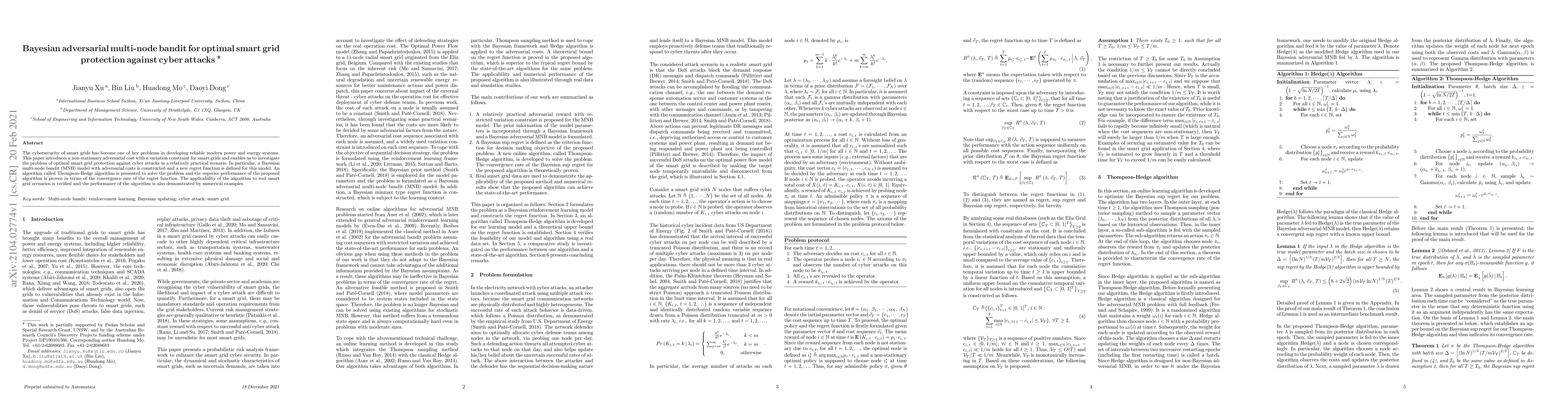 This paper proposes a Bayesian multi-node bandit model to optimize smart grid protection against cyber attacks, introducing a non-stationary adversarial cost with a variation constraint. The Thompson-Hedge algorithm is developed to solve the problem, demonstrating superior performance in regret convergence and validated through numerical examples.