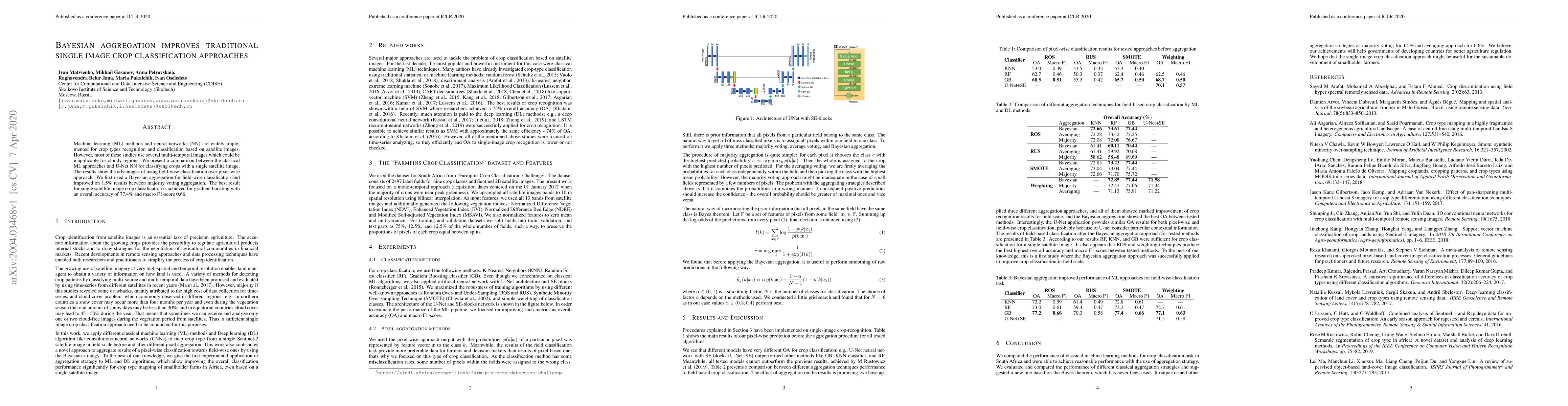 This paper compares traditional machine learning and neural network methods for classifying crop types using single satellite images, finding that Bayesian aggregation significantly improves field-wise classification over pixel-wise approaches. The best performance is achieved with gradient boosting, achieving an overall accuracy of 77.4% and a macro F1-score of 0.66.