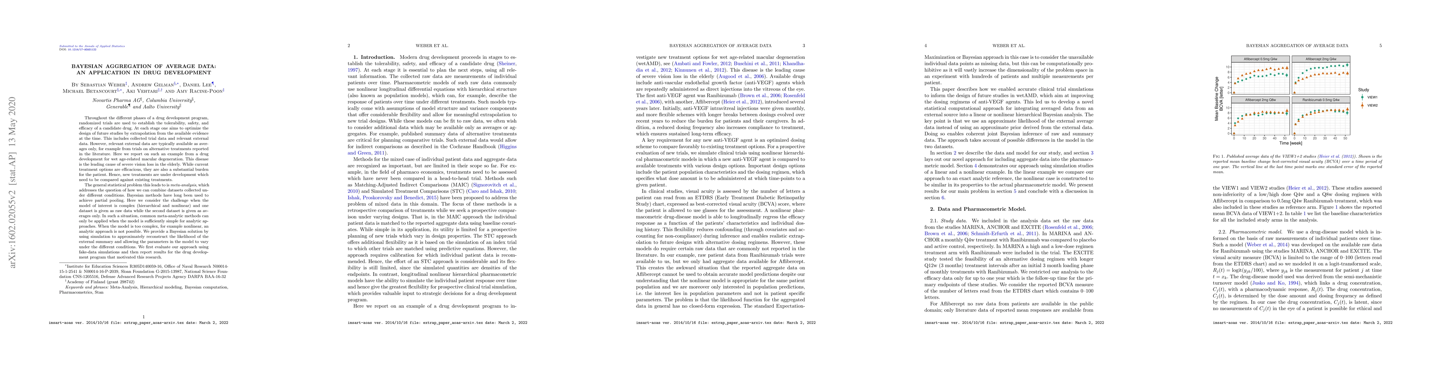 Throughout the different phases of a drug development program, randomized trials are used to establish the tolerability, safety, and efficacy of a candidate drug. At each stage one aims to optimize the design of future studies by extrapolation from the available evidence at the time. This includes collected trial data and relevant external data. However, relevant external data are typically available as averages only, for example from trials on alternative treatments reported in the literature. Here we report on such an example from a drug development for wet age-related macular degeneration. This disease is the leading cause of severe vision loss in the elderly. While current treatment options are efficacious, they are also a substantial burden for the patient. Hence, new treatments are under development which need to be compared against existing treatments. The general statistical problem this leads to is meta-analysis, which addresses the question of how we can combine datasets collected under different conditions. Bayesian methods have long been used to achieve partial pooling. Here we consider the challenge when the model of interest is complex (hierarchical and nonlinear) and one dataset is given as raw data while the second dataset is given as averages only. In such a situation, common meta-analytic methods can only be applied when the model is sufficiently simple for analytic approaches. When the model is too complex, for example nonlinear, an analytic approach is not possible. We provide a Bayesian solution by using simulation to approximately reconstruct the likelihood of the external summary and allowing the parameters in the model to vary under the different conditions. We first evaluate our approach using fake-data simulations and then report results for the drug development program that motivated this research.