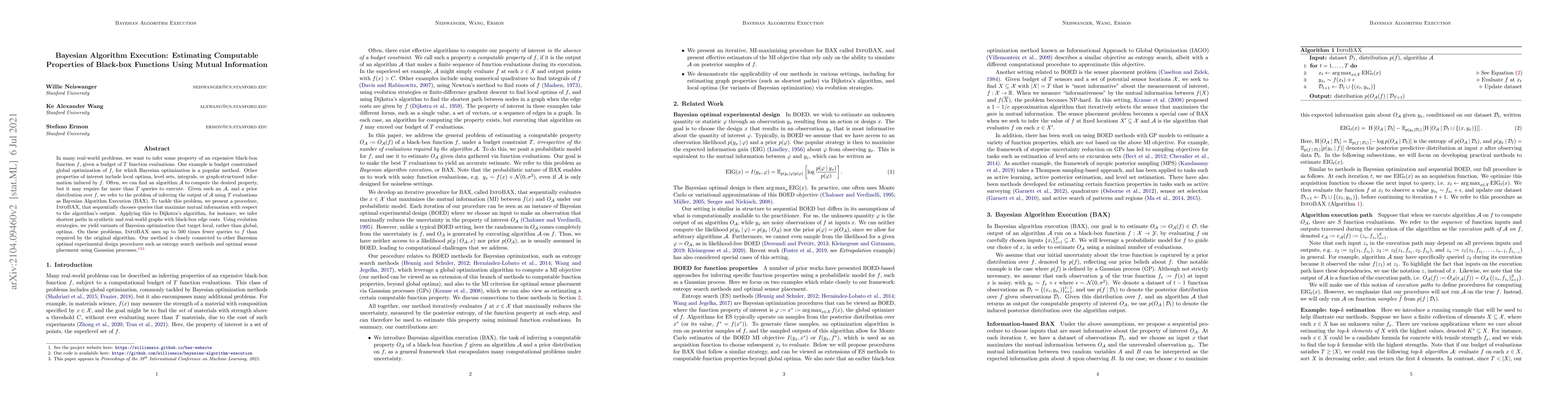 In many real-world problems, we want to infer some property of an expensive black-box function $f$, given a budget of $T$ function evaluations. One example is budget constrained global optimization of $f$, for which Bayesian optimization is a popular method. Other properties of interest include local optima, level sets, integrals, or graph-structured information induced by $f$. Often, we can find an algorithm $\mathcal{A}$ to compute the desired property, but it may require far more than $T$ queries to execute. Given such an $\mathcal{A}$, and a prior distribution over $f$, we refer to the problem of inferring the output of $\mathcal{A}$ using $T$ evaluations as Bayesian Algorithm Execution (BAX). To tackle this problem, we present a procedure, InfoBAX, that sequentially chooses queries that maximize mutual information with respect to the algorithm's output. Applying this to Dijkstra's algorithm, for instance, we infer shortest paths in synthetic and real-world graphs with black-box edge costs. Using evolution strategies, we yield variants of Bayesian optimization that target local, rather than global, optima. On these problems, InfoBAX uses up to 500 times fewer queries to $f$ than required by the original algorithm. Our method is closely connected to other Bayesian optimal experimental design procedures such as entropy search methods and optimal sensor placement using Gaussian processes.