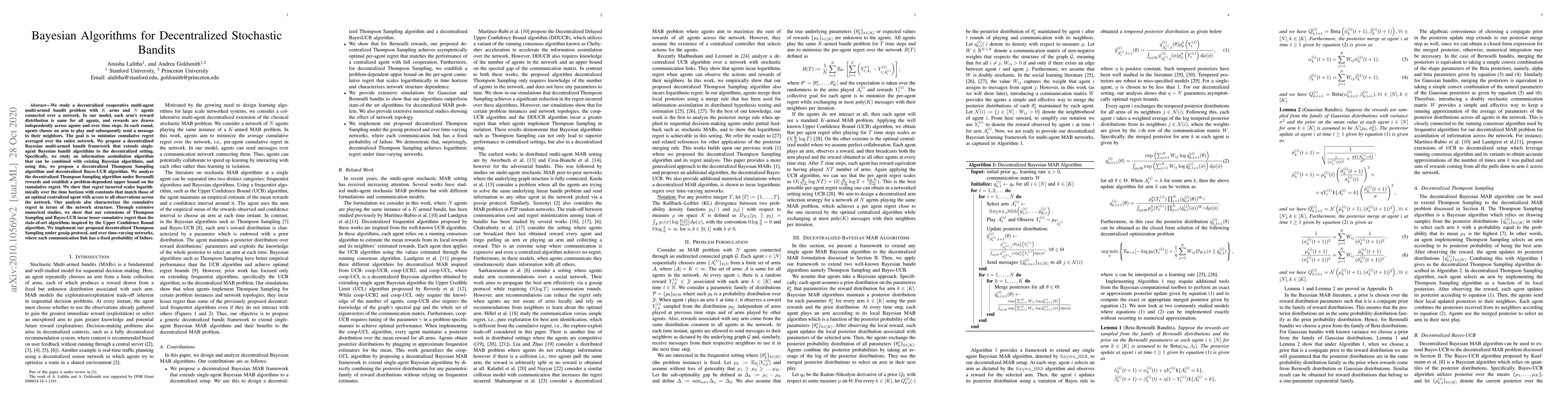 This paper introduces a decentralized Bayesian framework for multi-agent multi-armed bandit problems, extending single-agent algorithms to a networked setting. It proposes decentralized Thompson Sampling and Bayes-UCB algorithms, analyzing the former under Bernoulli rewards with a logarithmic regret bound matching centralized optimal agents. Numerical studies show reduced regret compared to state-of-the-art UCB-based algorithms, and implementations demonstrate effectiveness over time-varying networks.