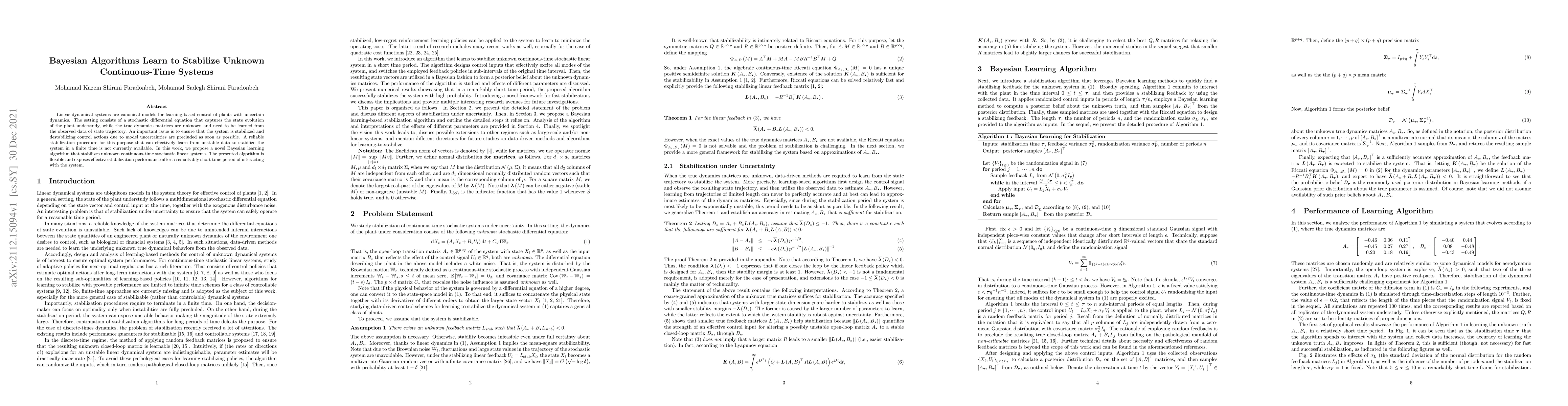This paper proposes a novel Bayesian learning algorithm to stabilize unknown continuous-time stochastic linear systems, addressing the challenge of destabilizing control actions due to model uncertainties. The algorithm efficiently learns from unstable data to achieve stabilization in a finite time.
