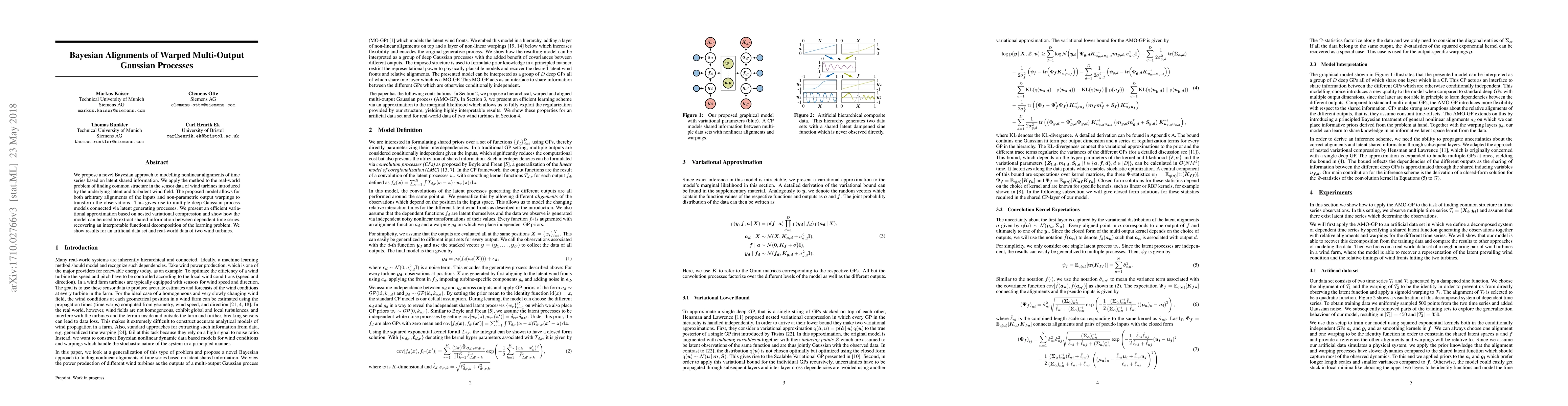 This research introduces a Bayesian method to align and analyze nonlinear time series data, like wind turbine sensor readings, by considering latent shared information. The model, called Bayesian Alignments of Warped Multi-Output Gaussian Processes, allows for flexible input alignments and output warpings, resulting in multiple interconnected Gaussian process models. An efficient approximation technique is presented, demonstrated on synthetic and real wind turbine data, enabling the extraction of shared information and functional decomposition of complex learning problems.