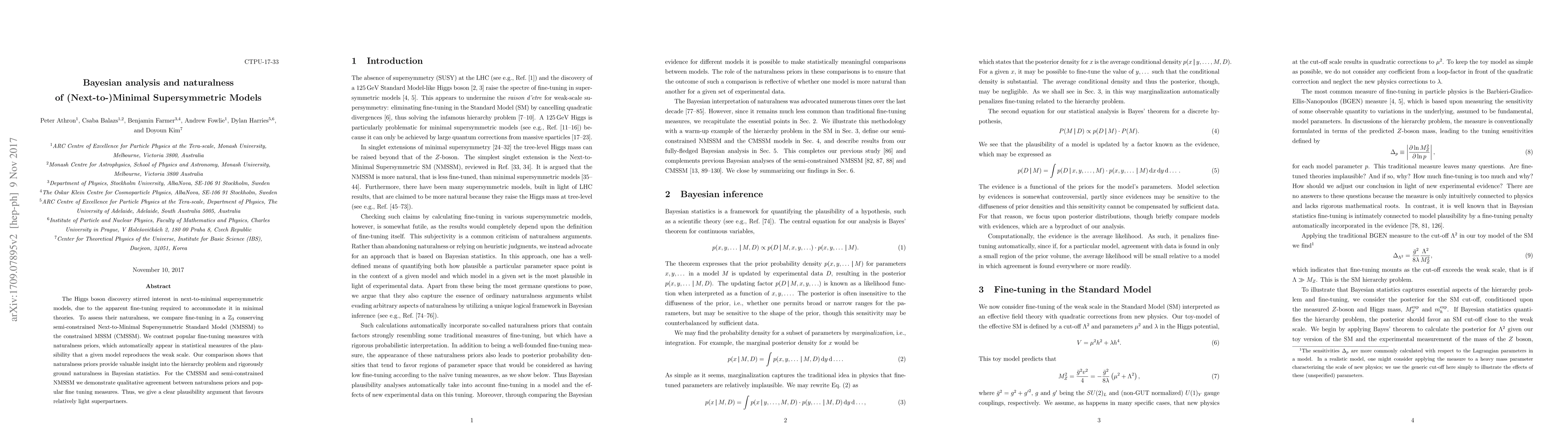 This paper assesses the naturalness of next-to-minimal supersymmetric models (NMSSM) compared to the minimal supersymmetric standard model (MSSM) using Bayesian analysis. It finds that naturalness priors provide a rigorous Bayesian framework for evaluating the hierarchy problem, favoring relatively light superpartners.
