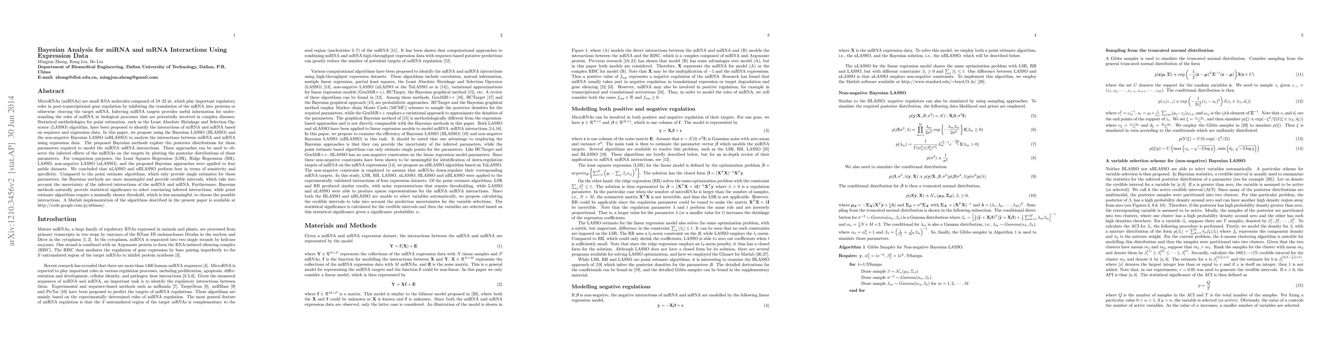 This paper proposes Bayesian LASSO (BLASSO) and non-negative Bayesian LASSO (nBLASSO) to model miRNA-mRNA interactions using expression data, offering posterior distributions for parameter inference. Comparative analysis with other regression methods shows that nLASSO and nBLASSO outperform in sensitivity and specificity, while Bayesian methods provide credible intervals and natural statistical significance for interaction selection.