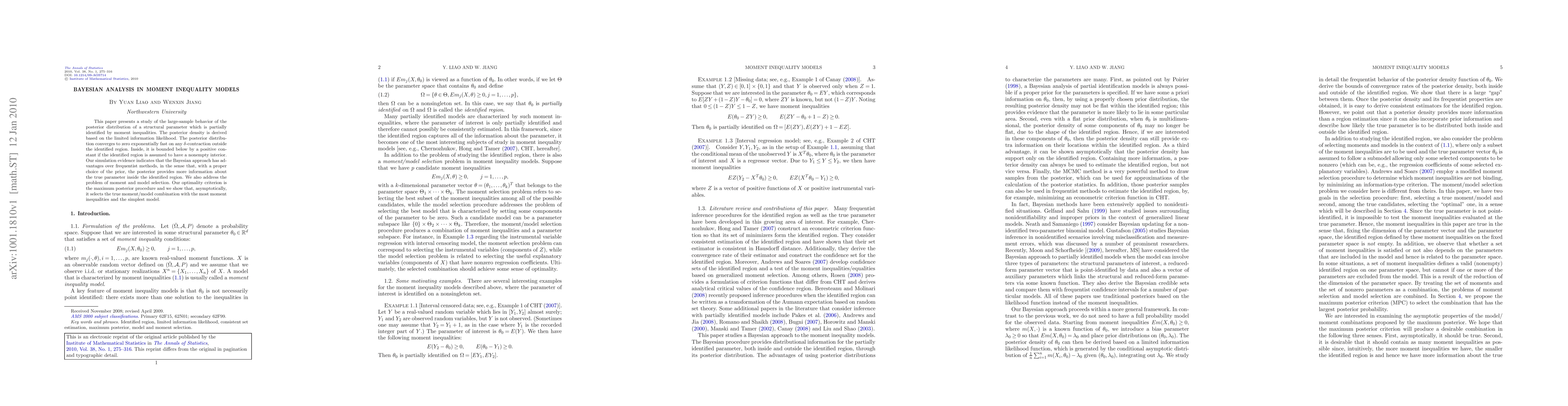 This research derives the posterior distribution of a parameter identified by moment inequalities, showing it converges to zero outside the identified region and is bounded inside. The Bayesian approach is found superior to frequentist methods, offering more parameter information with a suitable prior. The study also introduces an optimality criterion for moment and model selection, demonstrating the maximum posterior procedure selects the true moment/model combination asymptotically.