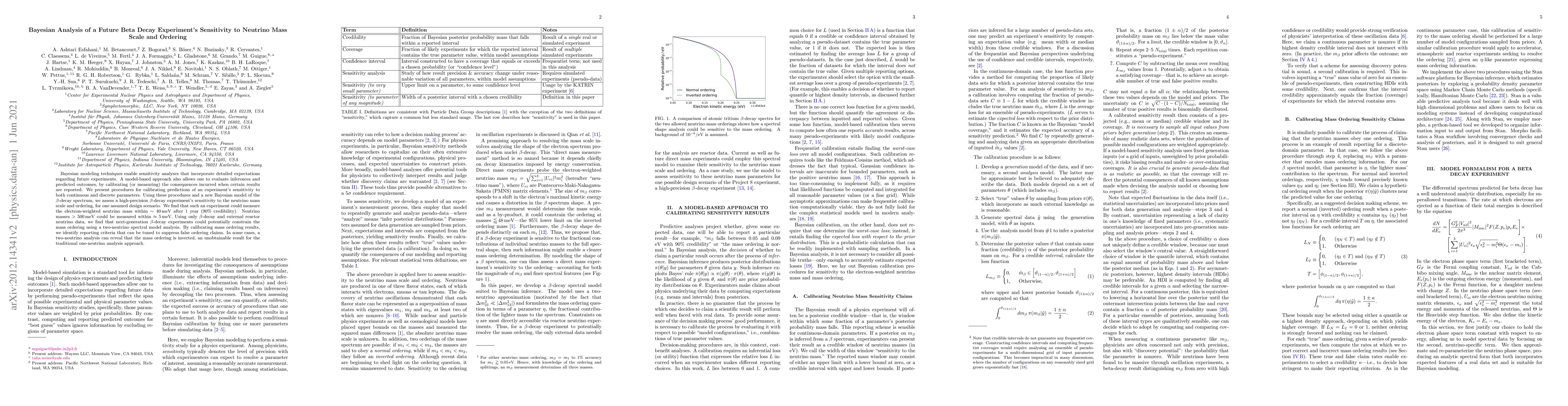 Bayesian modeling techniques enable sensitivity analyses that incorporate detailed expectations regarding future experiments. A model-based approach also allows one to evaluate inferences and predicted outcomes, by calibrating (or measuring) the consequences incurred when certain results are reported. We present procedures for calibrating predictions of an experiment's sensitivity to both continuous and discrete parameters. Using these procedures and a new Bayesian model of the $\beta$-decay spectrum, we assess a high-precision $\beta$-decay experiment's sensitivity to the neutrino mass scale and ordering, for one assumed design scenario. We find that such an experiment could measure the electron-weighted neutrino mass within $\sim40\,$meV after 1 year (90$\%$ credibility). Neutrino masses $>500\,$meV could be measured within $\approx5\,$meV. Using only $\beta$-decay and external reactor neutrino data, we find that next-generation $\beta$-decay experiments could potentially constrain the mass ordering using a two-neutrino spectral model analysis. By calibrating mass ordering results, we identify reporting criteria that can be tuned to suppress false ordering claims. In some cases, a two-neutrino analysis can reveal that the mass ordering is inverted, an unobtainable result for the traditional one-neutrino analysis approach.